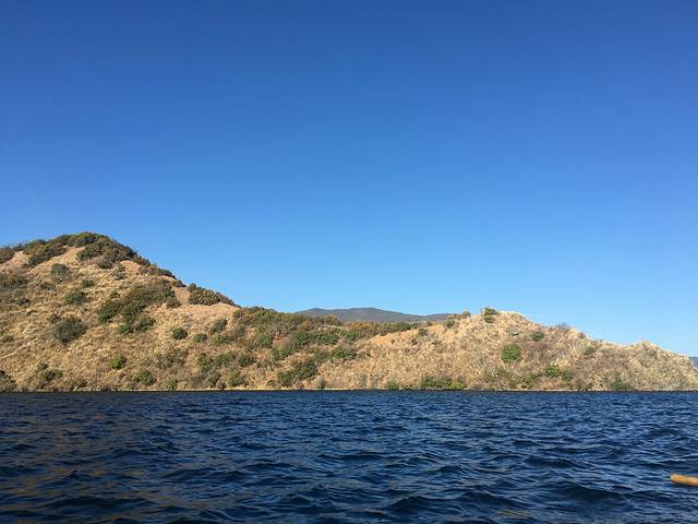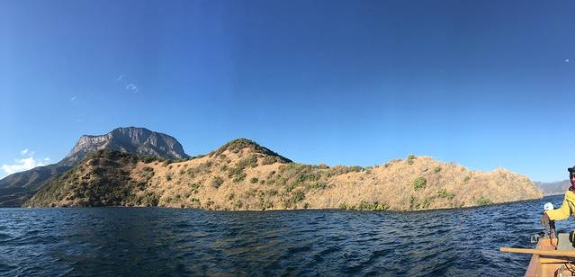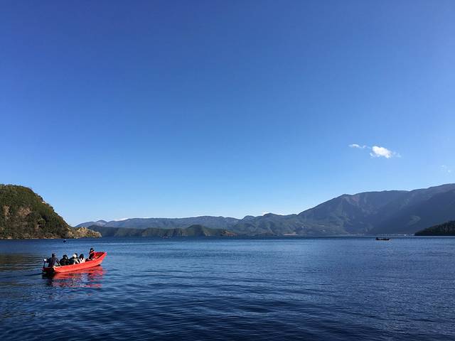 下山后沿着湖边石板路走到里格半岛的最深处,可惜都是客栈,不知道怎么上山。原路返回到岸边,决定乘坐小船到湖中去欣赏美景,看到了骆驼山,女神山。这里要给各位看官插播一个小故事,我们在船上的时候看见远处湖面上漂了一个白色的塑料袋子(不知是哪个游客这么欠揍),划船的阿姨立马就调转了船头,想把塑料袋捞上来,可惜湖面风太大,我们最终也没有追到那可恶的塑料袋,回头看划船的阿姨,脸上闪过的是无奈,也许更多的是心疼吧,心疼这片湖水,心疼湖中自由自在的野鸭和红嘴鸥。那一刻,深深的被震撼,也明白了为什么泸沽湖能一直保持着透明清澈,干净又纯洁。那里淳朴的摩梭人心里一定是不希望泸沽湖被开发作旅游的吧,在和外界无法联络的年代,是泸沽湖养育了他们,给了他们一切。