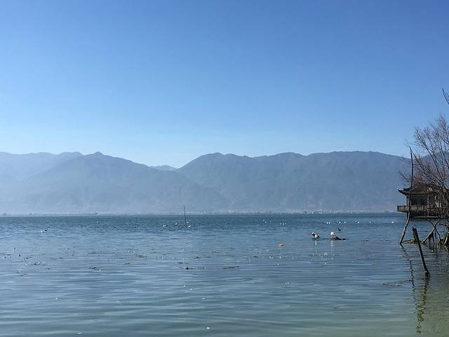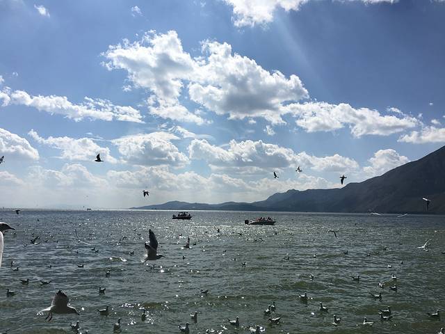到昆明似乎不去滇池心里就有了遗憾,于是带着一点点期待,带着一点点向往最终还是去了滇池。滇池距离民族村只有一站的距离,从民族村兜兜转转出来到滇池只有不到二十分钟的路程。去之前看别人的游记就已经知道滇池会有很多人,到了以后才发现人数多的已经超过自己的想象,据说这还是春节过后人数减少以后的情景。当然跟人数差不多的应该是水面上密密麻麻的红嘴鸥了,原谅从没见过那么多红嘴鸥聚集的我确实被惊艳到了。岸上有很多卖干面包的小贩,很多游客手里也都拿着干面包在喂红嘴鸥。我不知道他们是出于什么目的要喂食它们,仅仅是为了看它们飞起叼食的那一刻么?即使不喂食,它们一样会飞起啊(大写的迷惑脸)。也许是这里的红嘴鸥比我有见识,它们见惯了常年来来往往的游客,也习惯了从游客手里获取食物,大都已经忘记了自己还可以捕食小鱼小虾等天然美食吧。除了大量的红嘴鸥,拥挤的人群以及湖面上散落的面包渣,滇池还是名不虚传的,确实很美。滇池面积有330km²,那一眼望不到边的水平面,仿佛水天一线,与远处的青山连成一片,自成一幅山水美景画。岸上看完美景,吃完午餐,我们最后选择了坐30分钟的小艇在湖面上欣赏美丽的滇池,小艇的票价是60元/人。湖面上风挺大,吹跑了我的花环,很后悔没拿在手中,幸好都是真花,不会产生很大的污染。