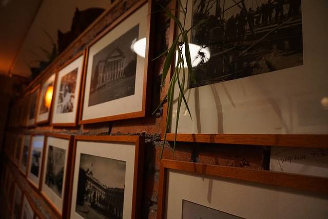 墙壁上挂着客栈从老房子装修搭建改造的照片