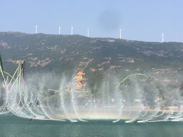 园区正中心的音乐喷泉,大概隔半个小时就有一次吧,水面有🌈,看到吗?
