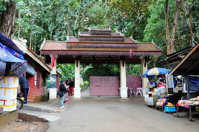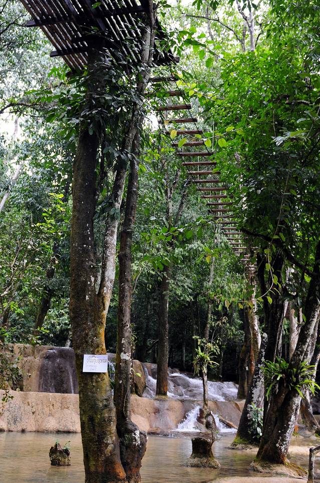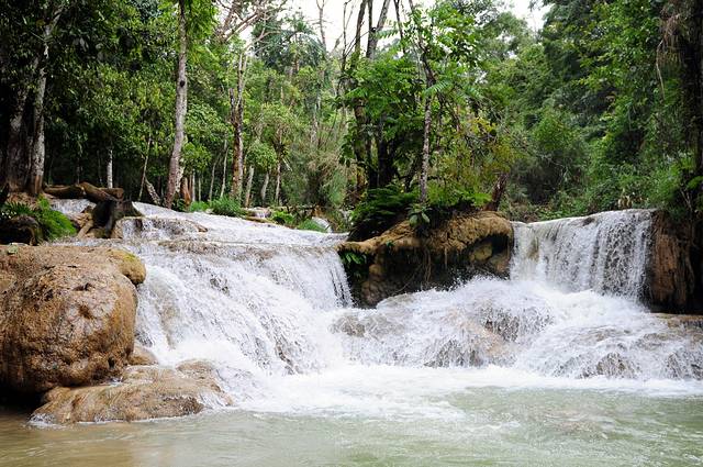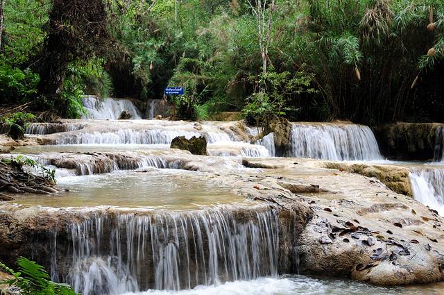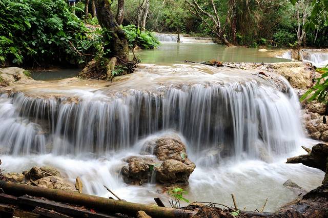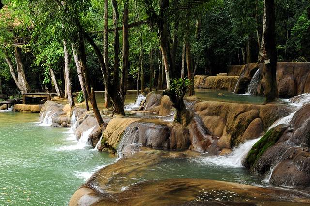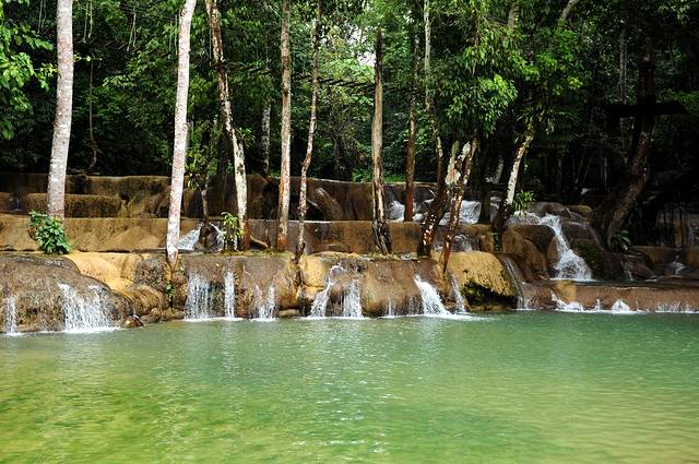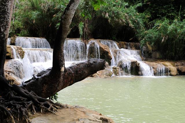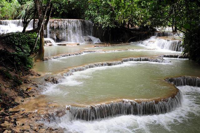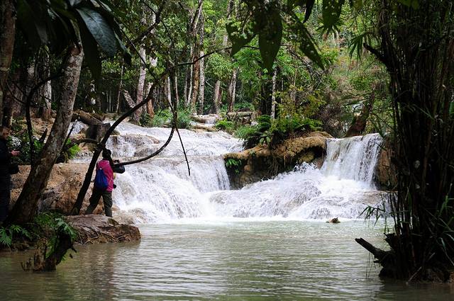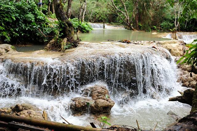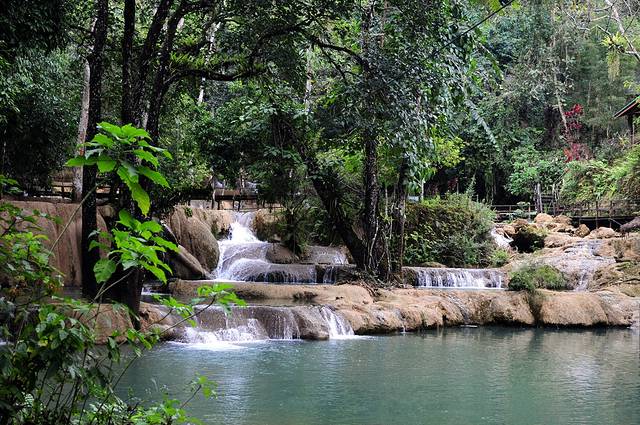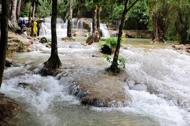 光西瀑布(Kuang Si Waterfall),由一个主瀑布和山下六七个小瀑布组成的瀑布群,景区内郁郁葱葱,空气清新,酷暑难当的琅勃拉邦,这里绝对是你不容错过纳凉消暑的好去处。瀑布群钙化的黄色池岩,湛蓝的湖水,乍一看还真有点四川黄龙的感觉。水池旁大树的树枝伸到了水池上方,大热天爬上树干,凹个最酷的造型,跳个水,游个泳,泡个澡,世界各地不同肤色的人儿汇集于此,撒个野,畅快淋漓。在不同的时候,它拥有不同的美丽。旱季的时候是纤细秀雅的精致的美丽。而到了雨季的时候,则是气势磅礴的壮观景象。我们逆着瀑布由下而上,路上遇到当地人在野餐,带着芭蕉叶包着的自带糯米饭和自制蘸料,真正的绿色食物。