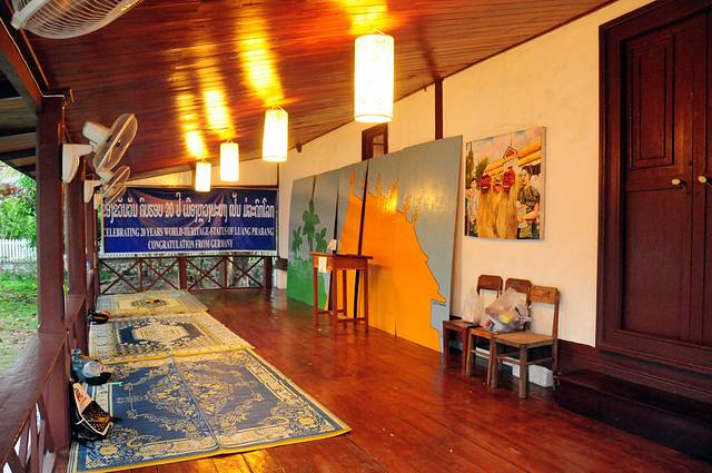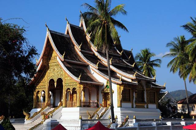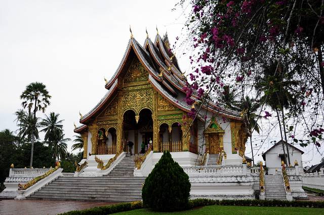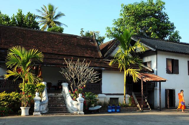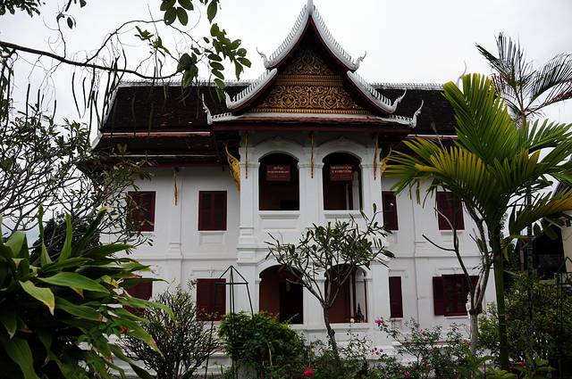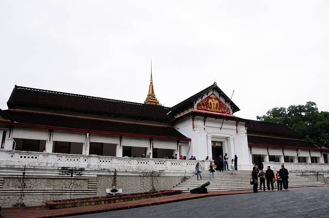往前走了几分钟就到了皇宫花园,也是古澜沧王国的苏发努冯国王的皇宫。1904年建的皇宫古朴典雅,是老挝式建筑与法式建筑的完美融合,里面可以参观国王的议政厅、起居室、餐厅、娱乐室等,重点参拜琅勃拉邦名称的拉邦佛,还有一些每个国家送给国王的一些礼物等东西。共产党入驻老挝后保留了老国王在此居住的权利,直至其去世,才改成博物馆,开放给游客参观。