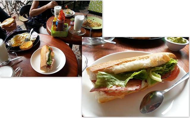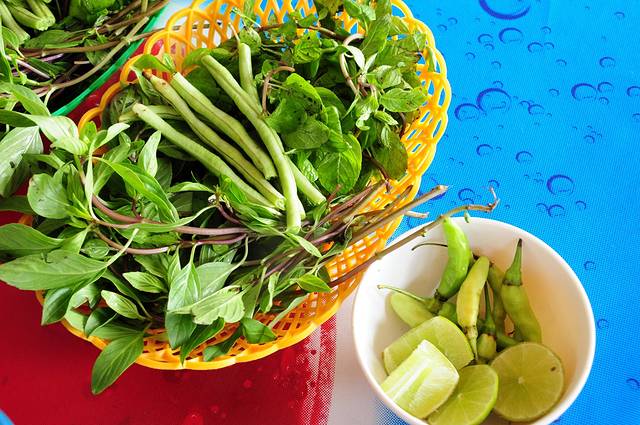 参观完手工村后我们在法国街溜达,今天要尝尝有名的老挝火锅!芒果花园餐厅的火锅一份要价12万,可供3-4人食用。老挝式火锅叫sin dad,是烫煮和烧烤一起的,炉火上放一个平底锅,中间是凸起很高的,用来烧烤,上面那块肥肉是用来熬油的。周围是盛汤用来烫煮的,有些配菜,调料可以自己调配,非常值得体验。当然我们4个光是这些配料是不够吃的,加了一晚面条和一份牛排,配上2瓶老挝啤酒才算吃饱,花了22万KIP,哈哈!