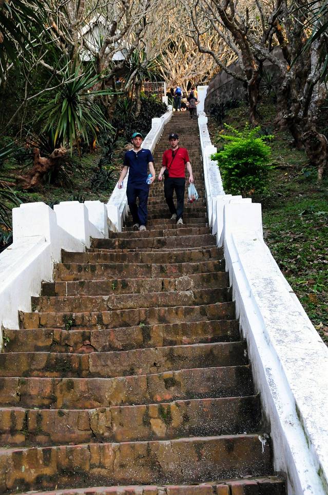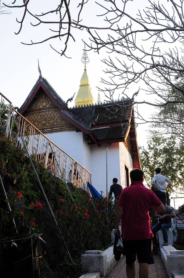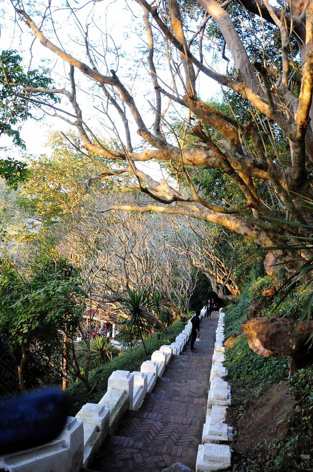 大约17:00到达琅勃拉邦,看天气和时间正好就打算去普西山看日落,这时,皇宫门前摆夜市的人们早早的支起了彩色帐篷。本想从另一条不收费的路上山,但苦于要走挺长一段又担心时间不够,最后还是从皇宫门前那条石梯路上山,半山腰有收费亭每人2万KIP,赶紧扑哧扑哧往上赶,唯恐错过日落的时间,上山的小道被林间斑驳的阳光投射下来照得很漂亮。
