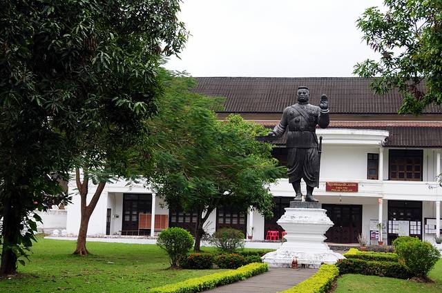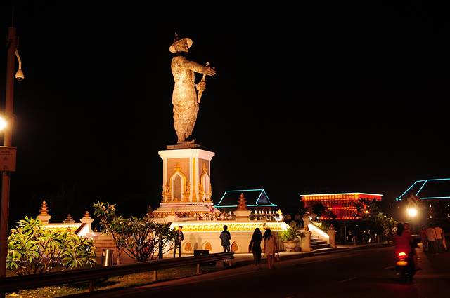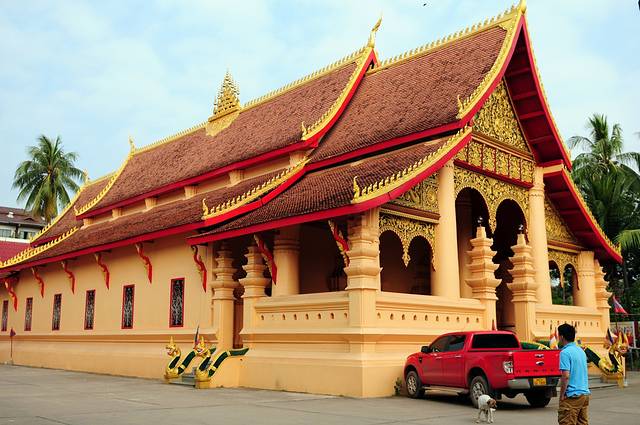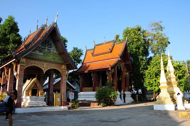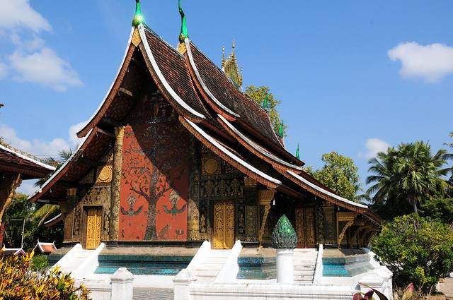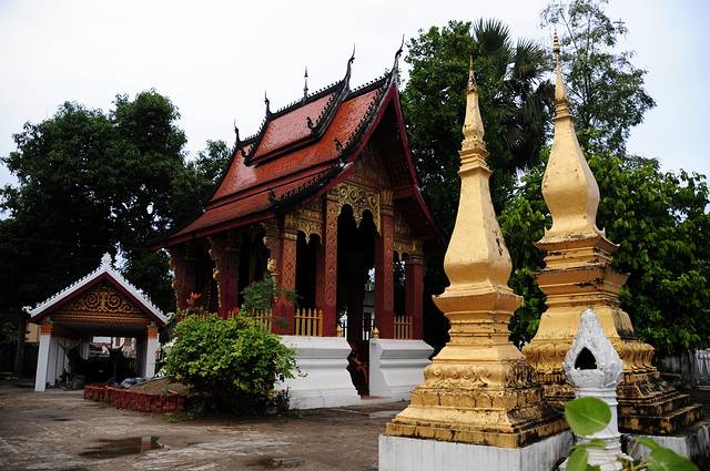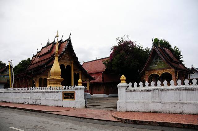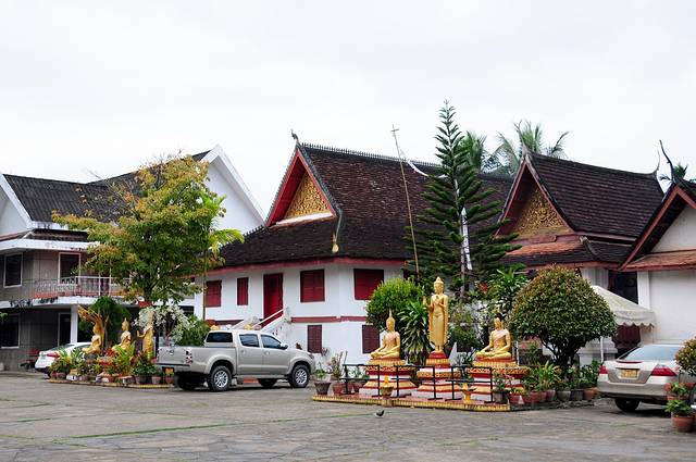 到了琅勃拉邦,无论你是在白天驻足欣赏老外街,还是在晚上徜徉于夜市的繁华,你总是无法忽视皇宫博物馆东侧的霍勃拉邦寺Wat Ho Pha Bang(Haw Prabang)的存在。这栋建筑实在是太醒目了,就好像琅勃拉邦的地标。极尽奢华的装饰,满眼全是炫目的金色和红色。据说这里是专门为了安直勃拉邦金佛(也就是一尊从柬埔寨来的勃拉邦金佛,老挝国宝)而设计修建的,这座城市也因他而命名。皇宫的西北角矗立着高达的苏发努冯的铜像,铜像未作任何标注说明。铜像后面有一栋宫殿建筑,现在称之为皇家剧院。皇宫的后院还有一个车库,陈列展示了皇室历年所用的座驾。