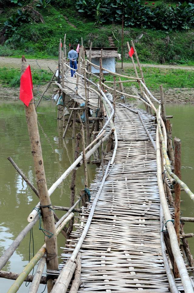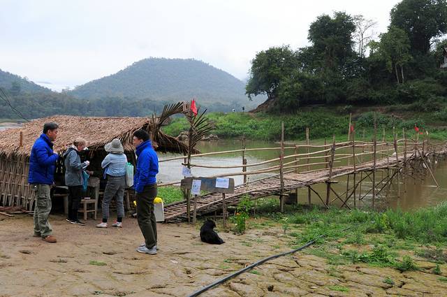 沿着Sakkarine Rd往南康河Nam Khan River边走,路的尽头是湄公河和南康河的交汇处,有一个竹桥,今天下雨天冷就无人值守,平常可是要买票的。琅勃拉邦的南康河之上,有两座竹排搭起的小桥,通过竹桥,可以前往隐秘在湄公河另一侧的村庄,体会更加宁静的乡村生活。竹桥由当地人在枯水期搭建,雨季来临,河水就会将竹桥冲毁,第二年又重新搭建。竹桥上有当地的村民收费,一般外国游客需要交纳7000KIP的费用,方可通过。