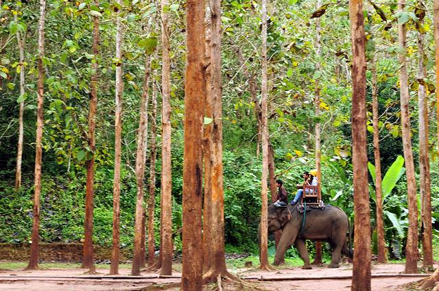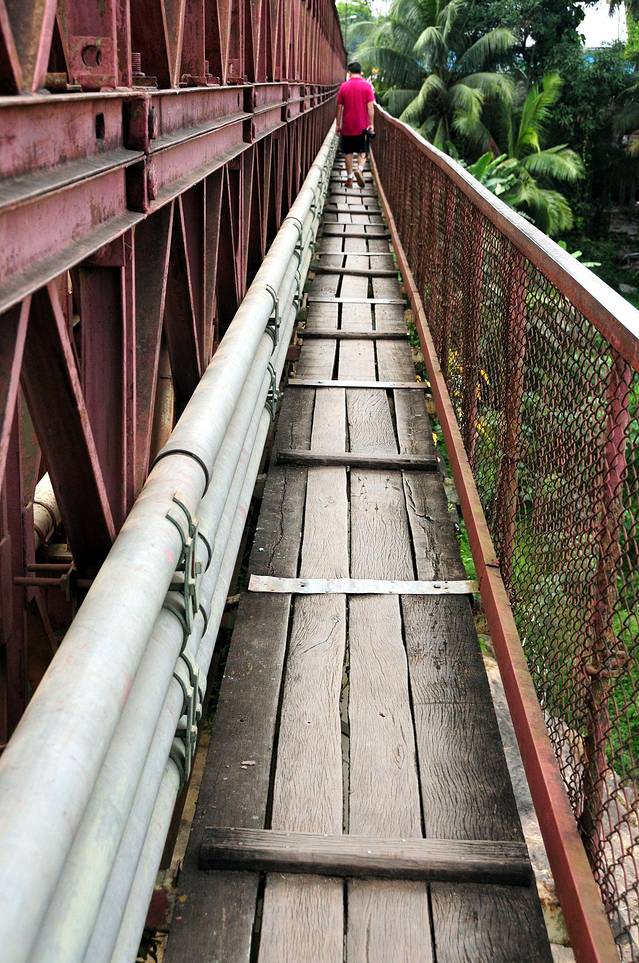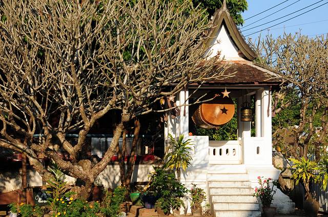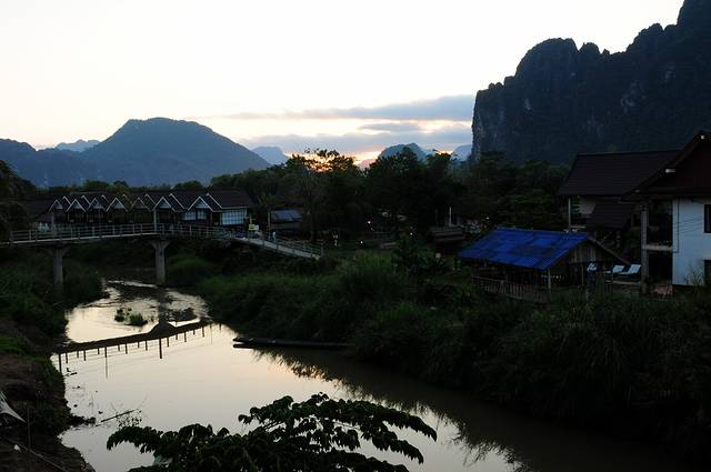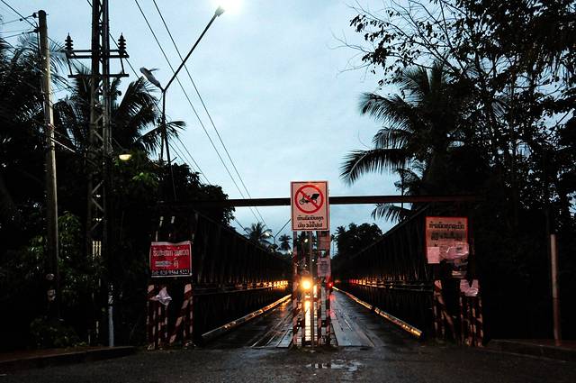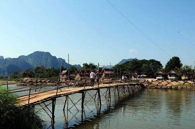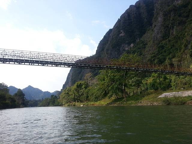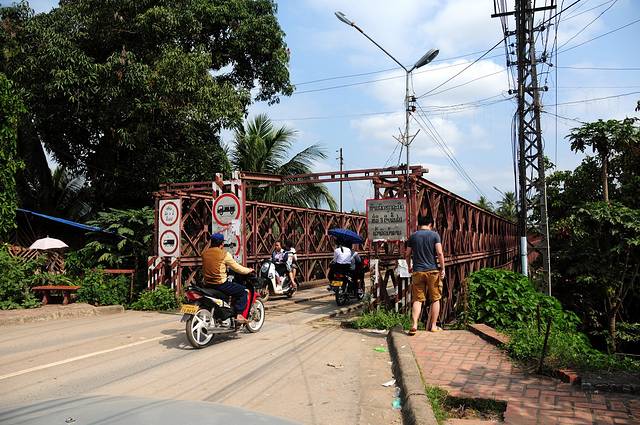 第二个是琅勃拉邦(Luang Prabang)的一座老桥(Old Bridge),莫名的就是觉得它很漂亮!钢的架子铺着木板,跨在南康河(Nam Khan)上,摩托车和自行车从桥中央的两排木板上驶过,和尚和村民从钢架外面窄窄的人行木道上走过,南康河的水从这里再往下流淌一小段,就会跟湄公河汇合。河岸很高,沿着陡峭的台阶下去才能够到河边,河水是黄色的,很平静,有细细的波纹卷动,但看不出浪花来。河上只有细细长长的船,像一根放大的豌豆荚,一排只能坐一个人,前后坐上七八个人也就满了,但脚下还是可以放一些蔬菜瓜果的。琅勃拉邦的高级旅馆基本都聚集在老桥附近。在老桥的下面,沿着Potoupakmao街两侧,有许多殖民地时期的老别墅改造而成的度假村,每一栋的屋檐下都会标注着建造年代,有些建筑已有一一百多年的历史。