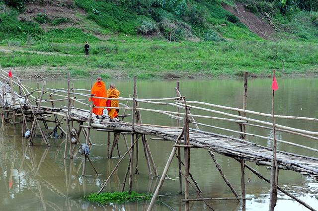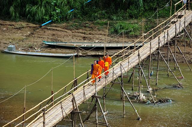 接下来我们顺着南康河去香通寺,在路边看见一家当地人在野餐,芭蕉叶包的糯米饭看似很香啊。再走不远就看到横跨南康河的另外一座竹桥,正好走来一队僧侣,在岸边大树的掩映下,很有意境啊!我们站在高高的岸上没看见这座桥有人收费。
