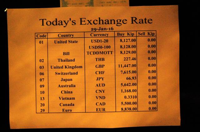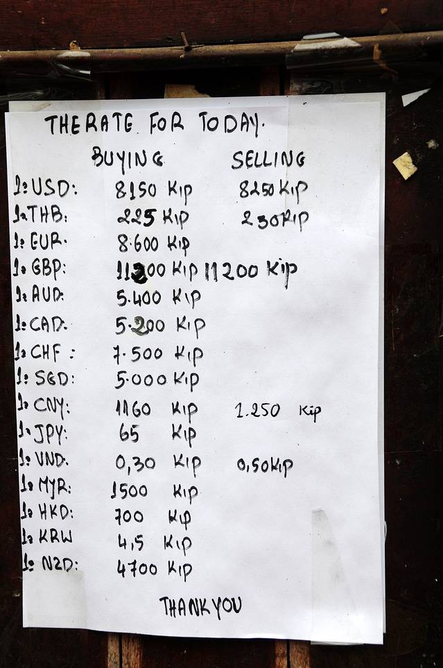 买好保险,再办理完车辆的通行许可后,就进入车辆验放程序。就该过边检了,驾驶员办好手续就退回来开车,其余人员就算出境了。这时,我们觉得小伙子很憨厚就禁不住一大群“挎包党”的游说,决定按1235换8000元人民币=9880,000KIP(老币基普),想着昨晚餐馆老板的提醒,我们4个人一起看着换钱的女人一摞摞一张张数好交给我们,而人群中又有人在游说何姐买手机卡,来时的车上我知道不能买他们的卡也交代了何姐,可她着急,卖卡人利落的剪了卡装上并试着调试,我想这也许就是他们故意搅乱我们注意力的手段吧。当时大约有十几个人围着我们,乱哄哄的,结果还是出差错了,以至于在琅勃拉邦下大雨出不了门那天我在房间清理账目,总也合不上,大家反复复核好多次才恍然大悟是在换钱时被这帮无耻的“挎包党”做了手脚,损失近450元。关于换钱的第二次陷阱,结尾再讲。