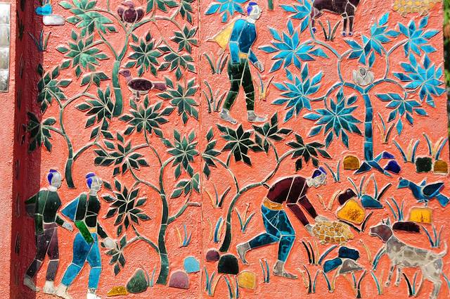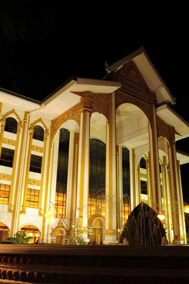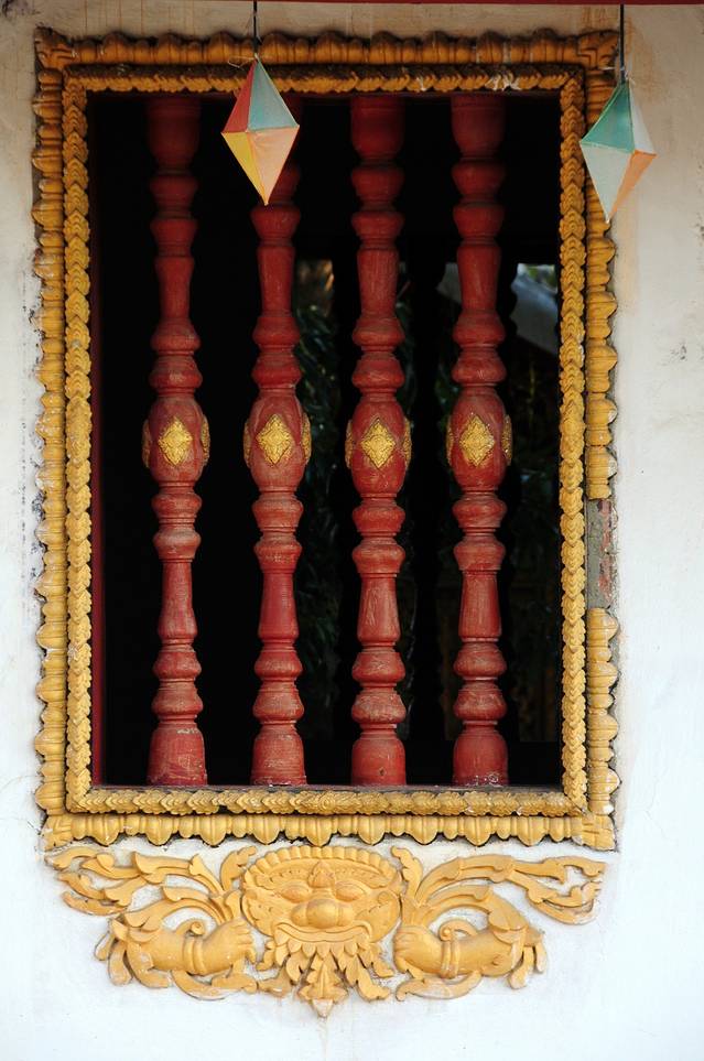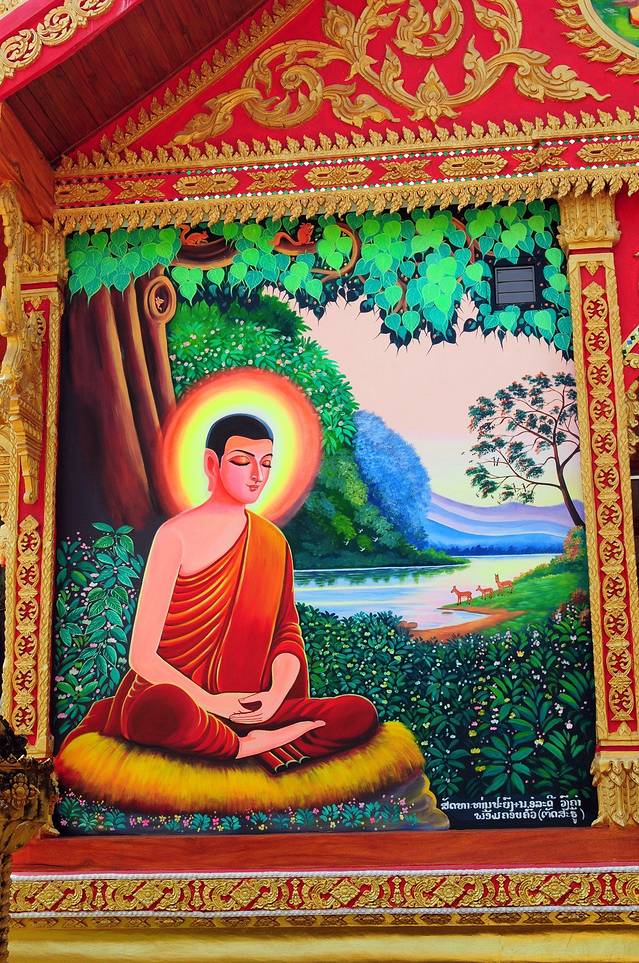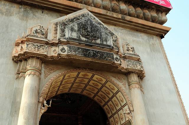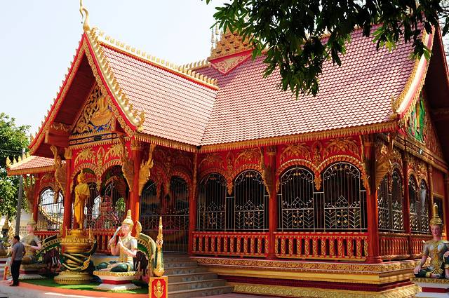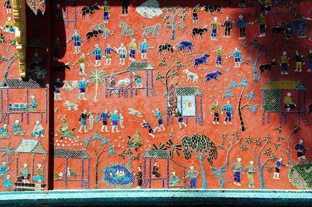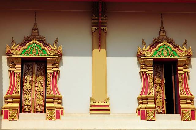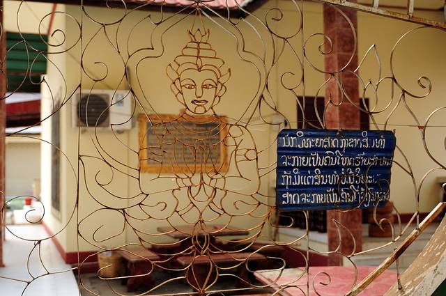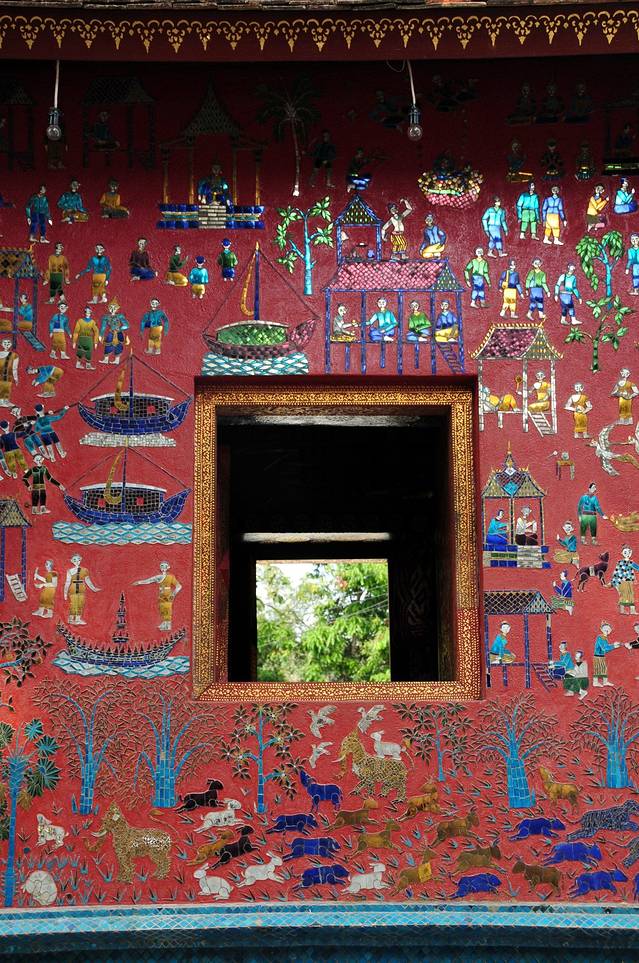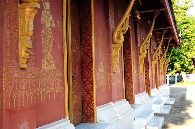 大殿内外的墙壁上是装饰精美的鎏金墙壁,描绘的是传奇人物占塔帕尼王(King Chanthaphanit)的丰功伟绩。