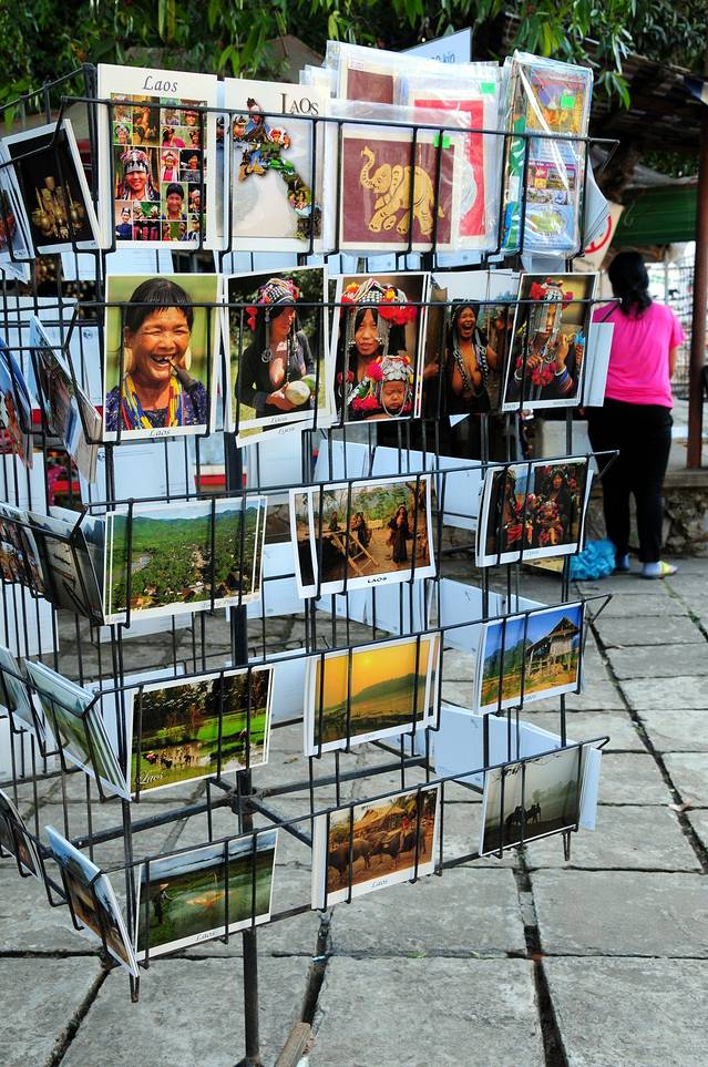 来到香通寺,把上午的门票给看门人说明想再进去一趟。架子上的明信片很有特色,照片上抽烟妇女已俨然是老挝的明星了。