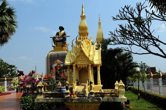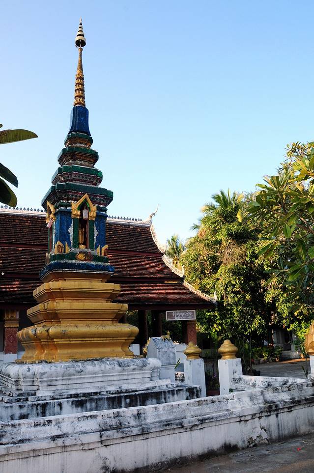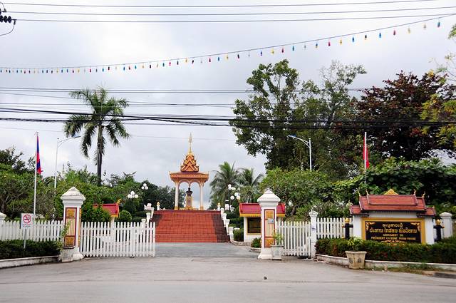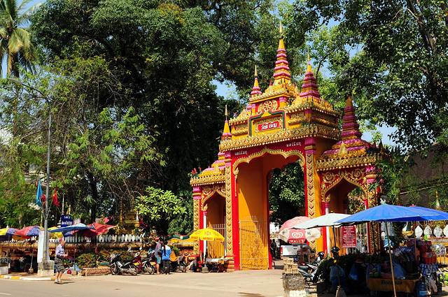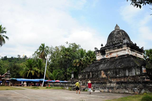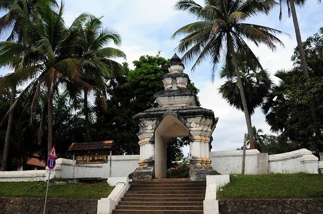 从老桥出来前行不远就是一座灰色斑驳、形狀特异的地标建筑That Makmo,俗称 watermelon stupa(佛塔)。这座位于维苏纳拉寺(VAT VISOUNNARATH)内的维崇塔,因形似西瓜,故“西瓜塔”的别称更为人熟知。西瓜塔大约建于16世纪,传说与万象市的塔峦相对应,塔峦象征男性,西瓜塔象征女性。当今“万象的小伙子英俊,琅勃拉邦的姑娘漂亮”的美传就来源于此。