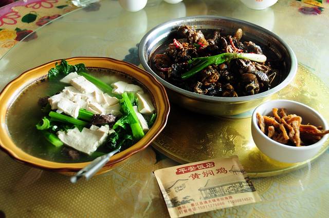找了家平安饭店,这里的鸡按只卖,黄焖鸡是招牌菜,一只鸡180元,感觉似乎真的是土鸡。苦菜豆腐汤是每次云南游必点的,苦中带甜还清火。