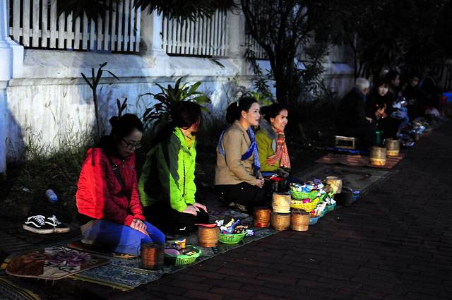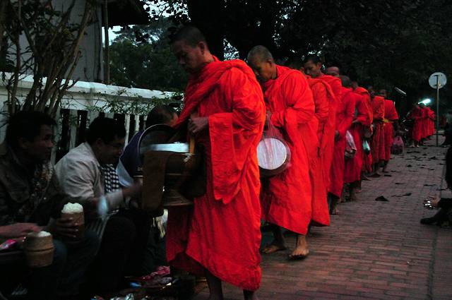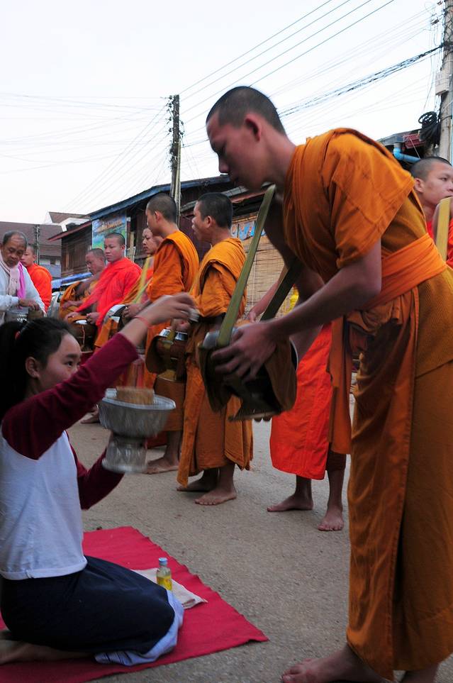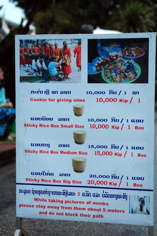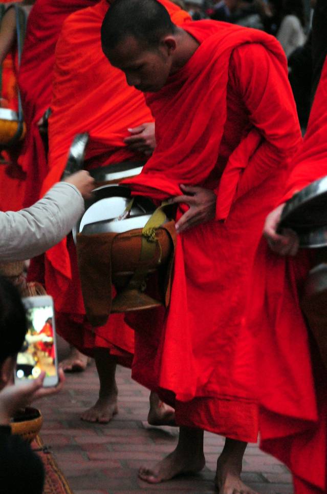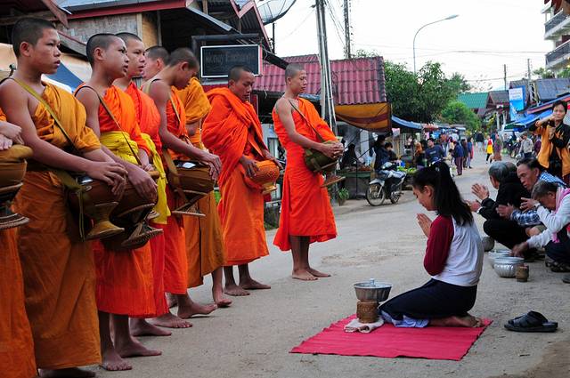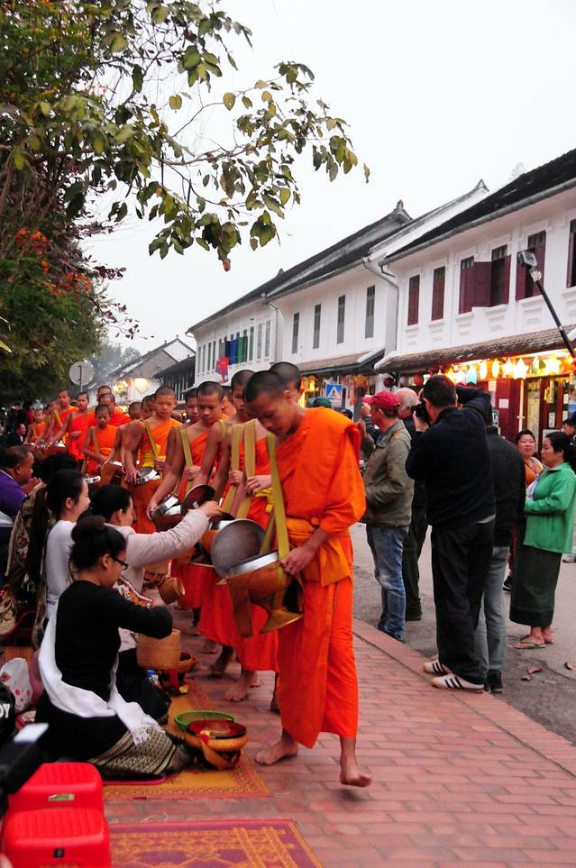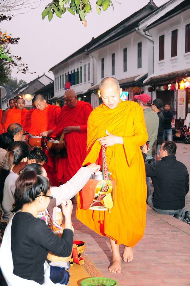 但到了琅勃拉邦,怎么能不去看布施?这也是琅勃拉邦闻名世界的一大文化遗产。《维摩经》中说:“布施是菩萨净土,菩萨成佛时,一切能舍众生来生其国”,也就是说,如果一心向佛,布施是学佛中简单、易行、契理、契机的修学法门之一。据载,入城行乞时,道侧而行,左手持钵,次第乞食;以维持生命为限,心不贪着,故得食时不喜,不得亦不忧,唯以除旧疾,养气力为要。布施是小乘佛教僧侣上千年来一直保持的传统习俗,历史悠久,在东南亚小乘佛教国家是很普遍的,但是由于琅勃拉邦古城区是世界遗产城市,庙宇众多且集中,所以这里的布施闻名于海内外。