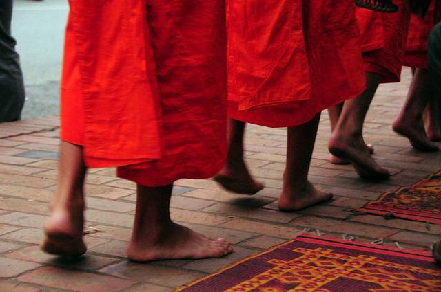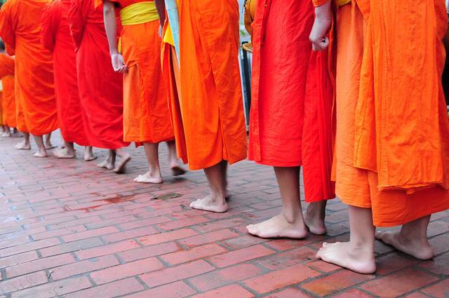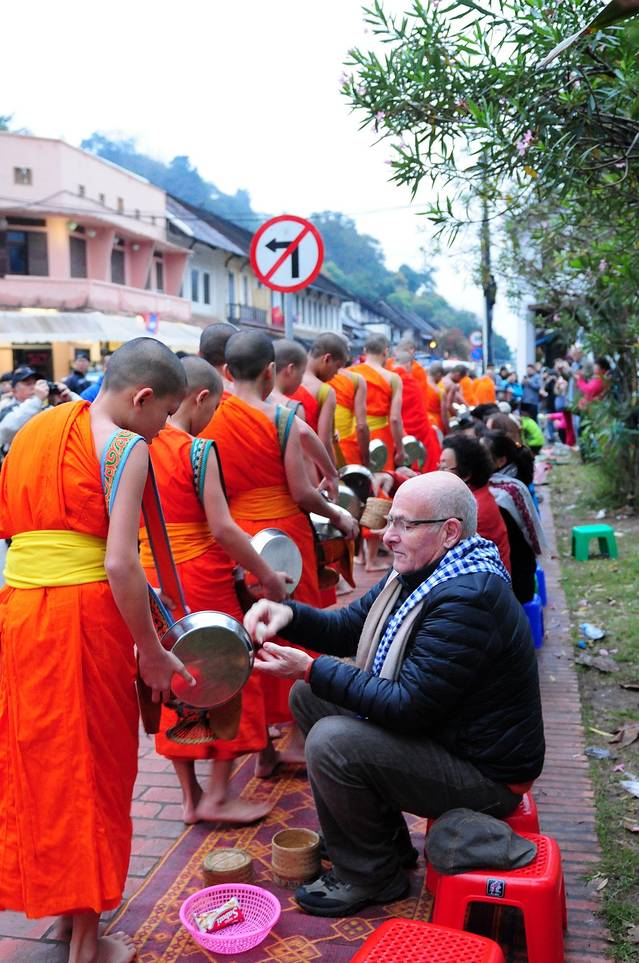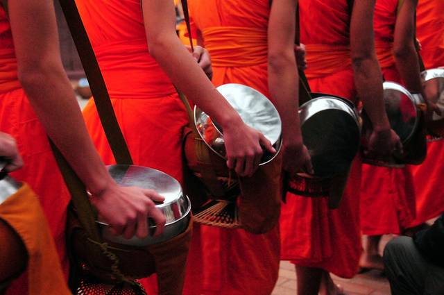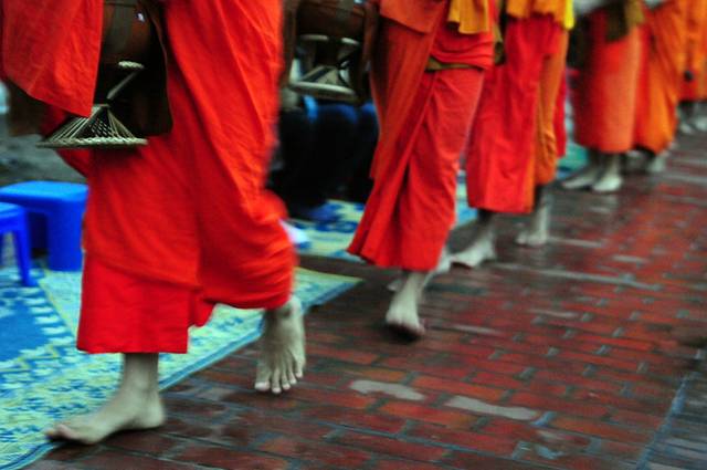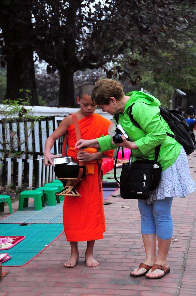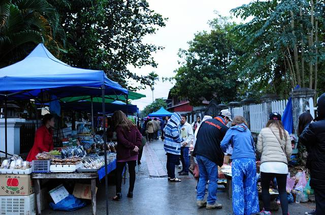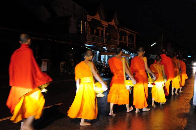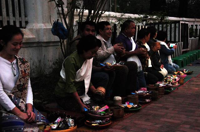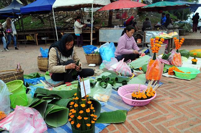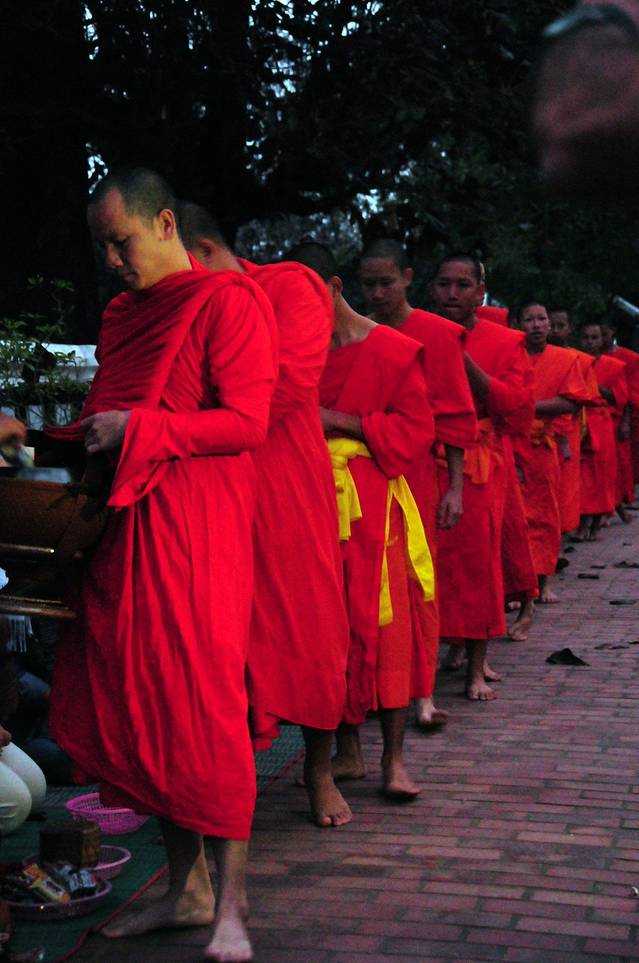 但到了琅勃拉邦,怎么能不去看布施?这也是琅勃拉邦闻名世界的一大文化遗产。《维摩经》中说:“布施是菩萨净土,菩萨成佛时,一切能舍众生来生其国”,也就是说,如果一心向佛,布施是学佛中简单、易行、契理、契机的修学法门之一。据载,入城行乞时,道侧而行,左手持钵,次第乞食;以维持生命为限,心不贪着,故得食时不喜,不得亦不忧,唯以除旧疾,养气力为要。布施是小乘佛教僧侣上千年来一直保持的传统习俗,历史悠久,在东南亚小乘佛教国家是很普遍的,但是由于琅勃拉邦古城区是世界遗产城市,庙宇众多且集中,所以这里的布施闻名于海内外。