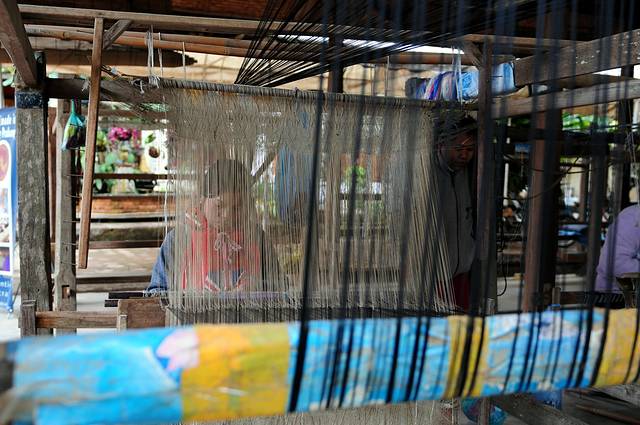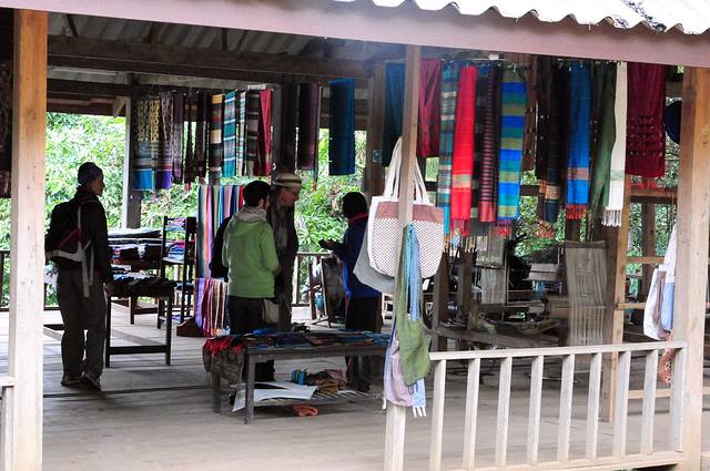 我们来到兰康河和湄公河交汇处就是那天俯瞰竹桥的地方,准备过桥到对岸的手工村去看看。老挝是农业社会,手工制造比较多。南康河的北岸有织布、造纸民间作坊集中的村子,人们称其为手工村。桥头有收费亭,过桥费7000KIP/人,和守桥的老太太讲价到5000KIP,有提示说可以过河去看1.textile gallery织物展览2.weaving编制3.wood carving木雕4.paper making造纸。过桥后顺着没有指示牌的大路边走边问,路边有大大小小的高中低档的棉和丝的纺织店铺,喜欢高档编织物的店铺,高档的就是不一样,真漂亮啊!每件都爱不释手啊,我相中一条围巾,喊价记不得了,讲价到14W(人民币112元),明显比刚买的那条用料更软,棉线更粗,做工跟精致,色彩更柔和。后来在法国街东段的店铺里也有相似的围巾,要价在22W以上了。