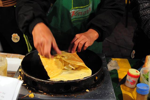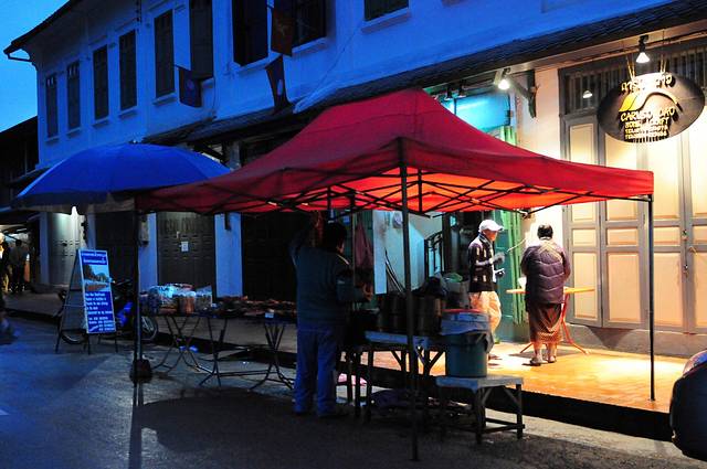 在一家旅行社买了地图2万KIP,回到咖啡馆付账11.3万KIP,老板告诉我们上普西山并非皇宫门前那一条路,从其他路上去还免费,上山看个日落还售票的确没道理。老板还提到一种老挝的特产叫腊木籽,吃了怎么好怎么好,每次回国他会带好多给朋友。告别老板时天色已晚,琅勃拉邦有名的夜市已经开始。说是平常天气好的话4点多就有人开始摆摊了,有人在叫卖一种creps(薄饼)看似好吃,有多种口味,我们买了香蕉和培根的共计2.5万,但不是很好吃,小贵。