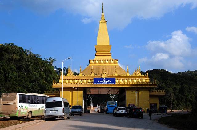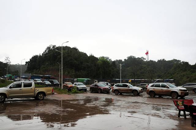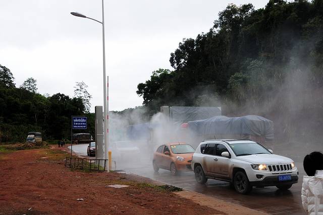 前行不远就是老挝磨憨(boten)口岸,远远就看见了金光灿烂富有老挝风情的金色佛塔国门。首先是汽车消毒,已经不是以前的人工喷洒,改为先进的自动喷雾了。在路边办公室交费2万KIP并填写车号开收据(务必收好)。接着就是过老挝边检,门口有个什么旅游基金交费处,按网友提示没理他!进门后按要求填写了入境卡,网上说不填就要交费2万,我们自带文化人就填了。当然我们看见好多国人很自觉的在护照里夹了2万,看来这已是一种“规矩”。驾驶员要递交从中国边检开具的查验卡(加盖放行章)和护照,我们4人拿着填好的入境卡排队边检,首先是LG,被索要2万,而我们三人均顺利过关,后来才知车辆过边检要收费2万。雨越下越大,热带的下雨天好冷啊,我们3人在等待LG开车过境时去了厕所,被收费2元X3人=6元。