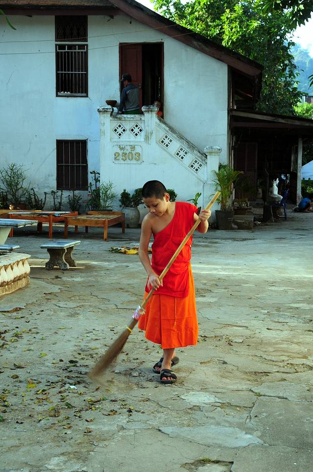 然后沿着法国街慢慢游荡,下午的光线照在两边古老的建筑物上仿佛时光停止,在春孔寺(Wat Choum khong)寺院里,几个小僧人站在光线下聊天,画面很美。还有的僧人在打扫院子,同样的宁静和谐。