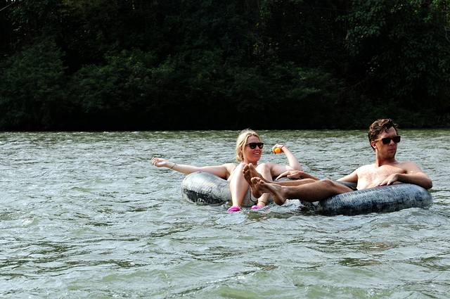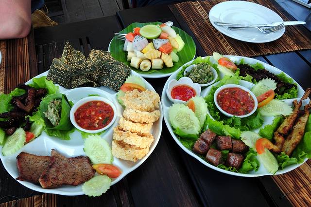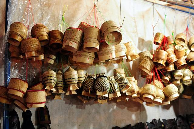 参观完香通寺来到河边餐厅吃了顿老挝餐,两大盘各式老挝美食拼盘光颜色就让人有食欲,高大的椰树下吹着河风很是惬意。这两盘都会搭配竹篓装的糯米饭,糯米饭是老挝当地人的主食,也是琅勃拉邦等地布施的主要物品。当地人一般将糯米洗干净,不加水直接在竹笼里面放在锅上用柴火烧,所以香糯又有嚼劲。小伙子端来两大两小的主楼糯米饭,还打趣的说大的给男的,女士则是小份的。