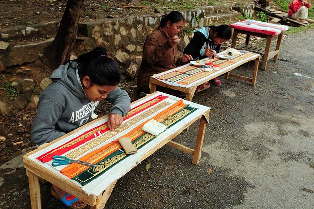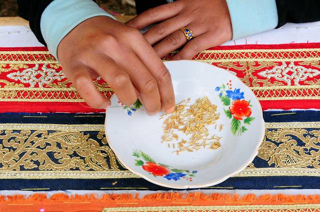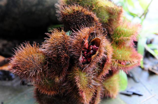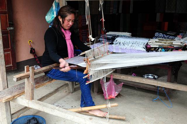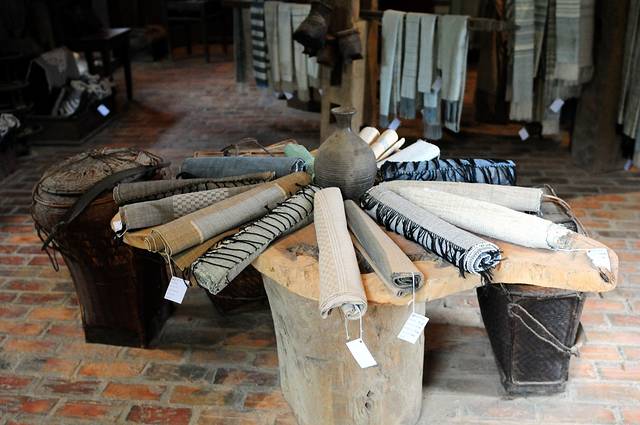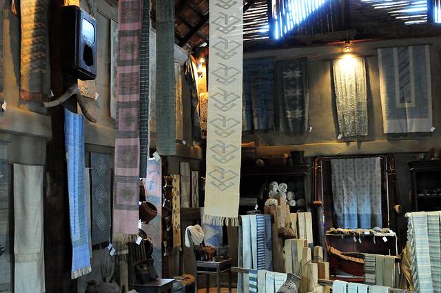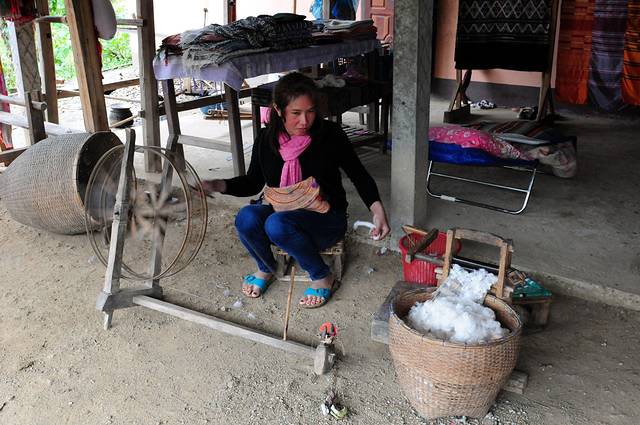 返回时路过一个村子见一个大姐在编制,大姐饶有兴致的介绍房屋旁边种的树上结的果就是棉花,摘下棉球用工具蓬松,绕在棍子上做成条状,再上纺机纺成线就可以上机器织成围巾了,大姐还指给我看屋旁的一颗结满橘色果实的树,打开果子,里面的核敲碎就渗透出一种橘色的汁液,可以用来染色织物,真的是纯天然啊!我们买了3条围巾,3万/条,你要知道大姐是不会讲英语的,这买卖全是在鸡同鸭讲的氛围中完成的。