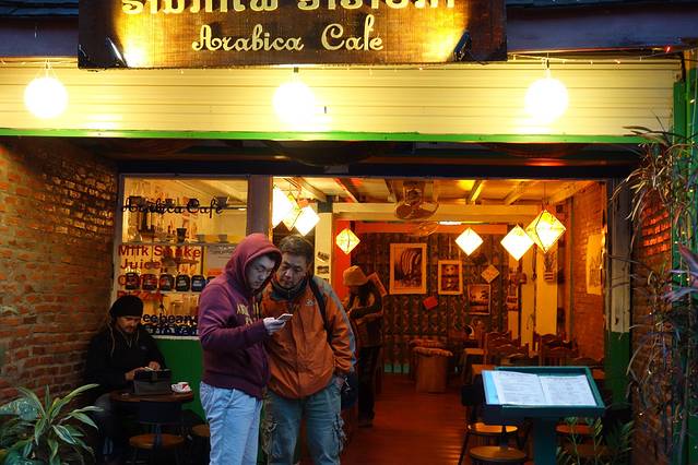 看完日落下山,夜市的灯光让人温暖,再次流连于夜市上各种琳琅满目的小商品,总觉得看不够。回到停车的地方,在街角不起眼的地方发现一家安徽来的父子俩经营的味多多小餐馆,价格合理,我们要了面条和炒饭花费7万,味道不错。打算明天再来,回客栈休息准备明天早起看布施!