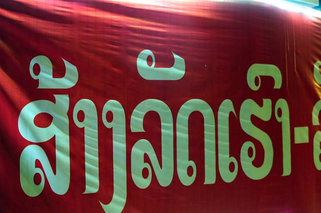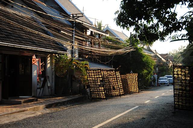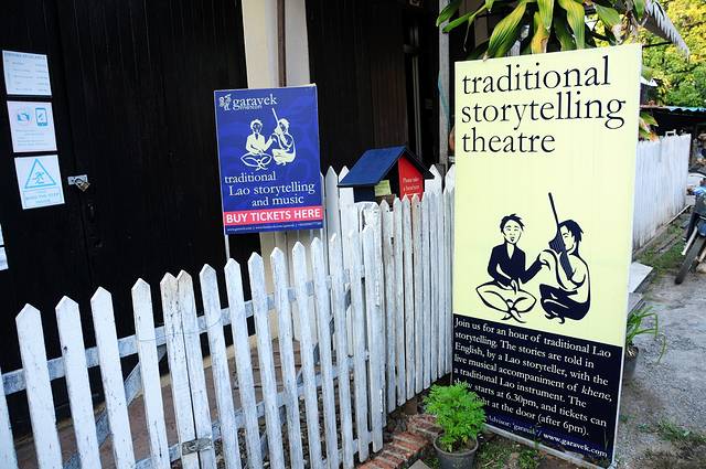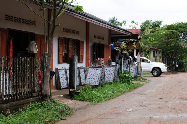 从香通寺侧门出来沿着一条巷子走,路边有晾晒的米饼,穿透过阳光的米饼应该更好吃,糯米饭( khao niao)吃不完也可以做成糯米饼晒干后保存。看见一个故事厅的广告画,要想了解琅勃拉邦的历史故事也许是值得听一回的。