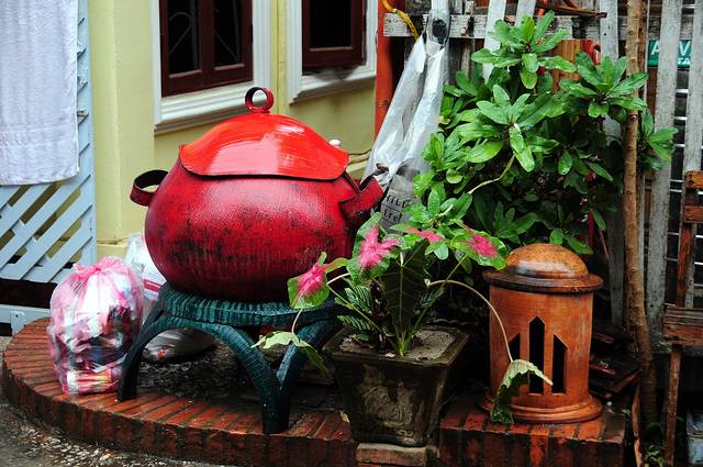 我们拐进皇宫花园侧面的一条小街,天气很冷又在下雨行人不多,路边的餐馆挺漂亮,穿过小巷就到了湄公河边的大路上,两边分布着餐馆和客栈,大白天很冷清,说是晚上人多很热闹。在穿过小巷子回到法国街的时候发现了这个红色的像苹果样的容器,你猜是啥东东?它其实是个垃圾桶,是不是很佩服老挝人的想象力。
