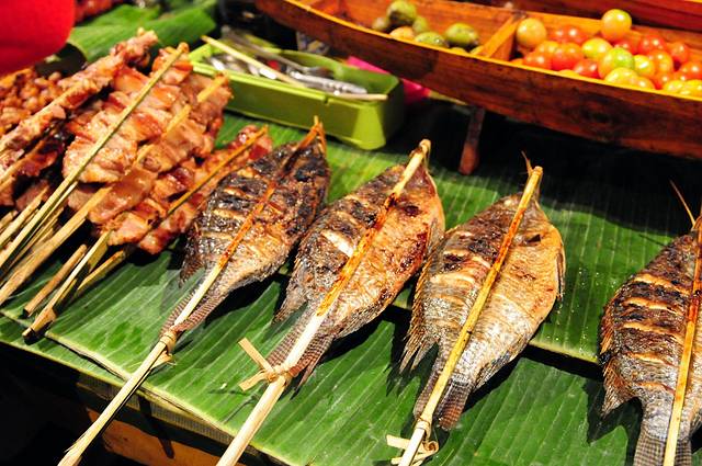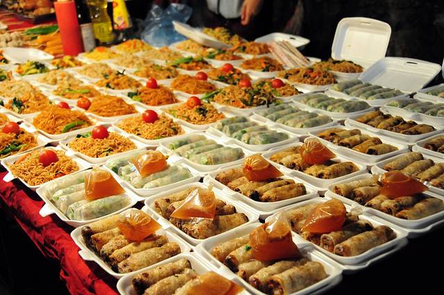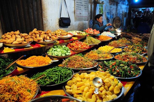 晚餐决定尝尝有名的素食自助餐,在早市街和夜市街连接的一条小巷里面,就是国花酒店旁边的巷子里,聚集着很多类似于自助餐性质的特色素食铺, 五彩缤纷玲琅满目的素食看着还是很吸引人。不宽的巷子里 可以说是人山人海,大批的老外都来这里光顾。一个大碗1.5万kip(尽可能的装但只能装一次)换算成人民币就十二元,非常划算,食材都是凉的可以加热(但不会热得很透),但真心不太好吃。店铺各种烤肉饮料是另外收费的,一条一斤多重的罗非鱼,烤熟后6万kip,换算成人民币四十八元。