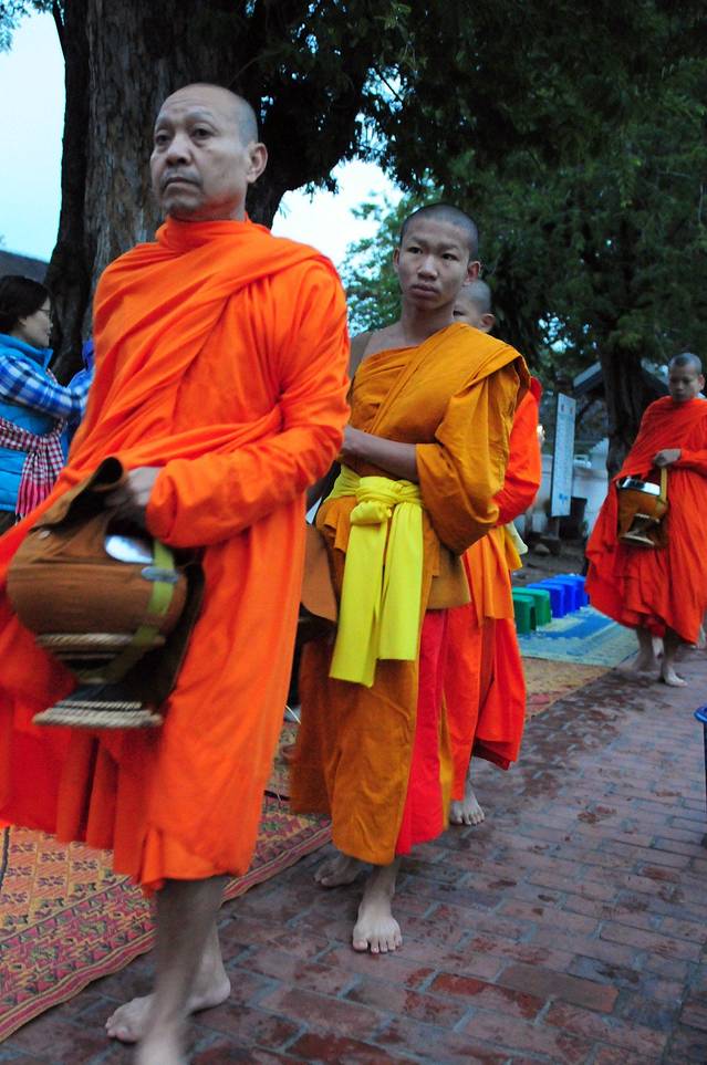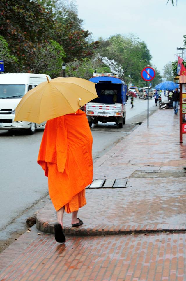 早上5点半起床没见下雨就决定去看布施,清晨的琅勃拉邦就是一条橘色徜徉的河流,各大寺庙的和尚在早上5:30-6:30之间在个主要路口排队接受布施。其实,这是我们来琅勃拉邦的第四天,前些天因为下雨也还因为我们会在这里呆几天也就不急于去看布施,每天自然醒,放慢自己的节奏。“久在樊笼里,复得返自然”,我们这些都市人来到老挝,感觉似乎回到了“老窝”,不急着参观、不急着游览、不急着赶往何处。窝着,慢哉!就是想哼哼那一段越慢越悠扬的曲子,咀嚼这段越慢越美丽的日子。