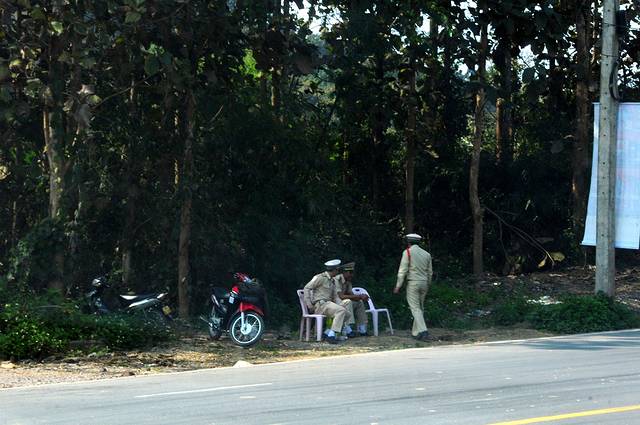 刚出勐赛不久就遇到交警捡察,我心里一惊,难道真要开启网上说的罚款模式?,网友说过,中国自驾车就是老挝警察的移动ATM提款机,他们会无中生有、毫无理由的罚款,通常是按警察的人头算,每人10万KIP。很不幸遇上了,咋办?警察示意靠边停车,摇下车窗,我心里在盘算,是把钱准备好还是软磨硬泡?当然沉着冷静是必须的,我决定死马当成活马医!我拿着资料袋下车并向警官问候“赛白底”(你好),他楞了一下转而回复我“赛白底”,然后领着我到路对面交给伞下一个年轻的警察,这警察哥哥英语挺好,问了从哪来去哪里,瞎聊了几句就放行了,走时还不忘嘱咐我下雨天慢点开注意安全。回到车上,得到一个“外交官”的称号!