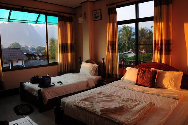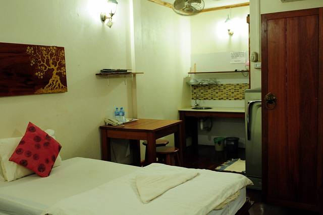 早上起来,大雨滂沱,回笼觉睡到自然醒后换房到川湘食府,标间10万,房间设施一般不过有厚被子,居然有电热水壶可以满足国人需要。收拾完也不想冒雨出去游览就到附近的阿海米粉饭店吃了越南米粉,2万(合人民币16元)一碗分量较少,一个鸡蛋1万,真心贵!吃完都11点了,雨越下越大,一直等到下午都没见雨停,说这是老挝近几年来罕遇的大雨,主要是受到我国大范围降温的寒潮影响,这样的冷天气对老挝来讲几乎就是灾害。