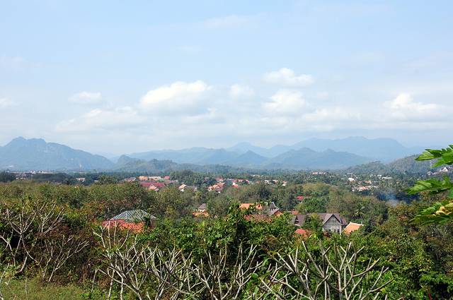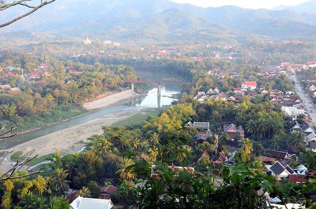 普西山虽然只有几十米的高度,却已然是琅勃拉邦的制高点。前山和后山都可以登顶。高处远望,琅勃拉邦城尽收眼底,不同的方向有不同的景,湄公河、南康河、二战桥、茂密的绿树,红色的小屋、金色的佛塔、河水中升腾的雾气,一幅和谐的生态画卷。天空下,静静流淌的湄公河水、郁郁葱葱的连片绿色和一幢幢红瓦顶的小房子,一切都是那么和谐美好。
