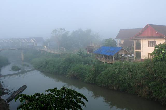 在加油站上厕所,刚上完路边一个打伞的大姐就过来收费,0.2万/人。大约16:00点遇上修路赌了半小时,山上大雨大雾,能见度很低,90度和180度的弯道一个接一个,坐后排的人被甩来甩去犹如坐海盗船,晕车在所难免啦。沿着N13公路经过了无数村庄,老挝北部算是全老挝最穷的,简易的茅草屋,许多小孩衣不蔽体但看见我们都友好的微笑。在遇到第二次修路堵车半小时后,紧赶慢赶,到琅勃拉邦已是晚上19:00点了。