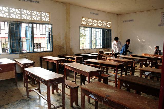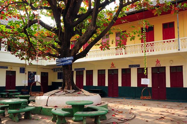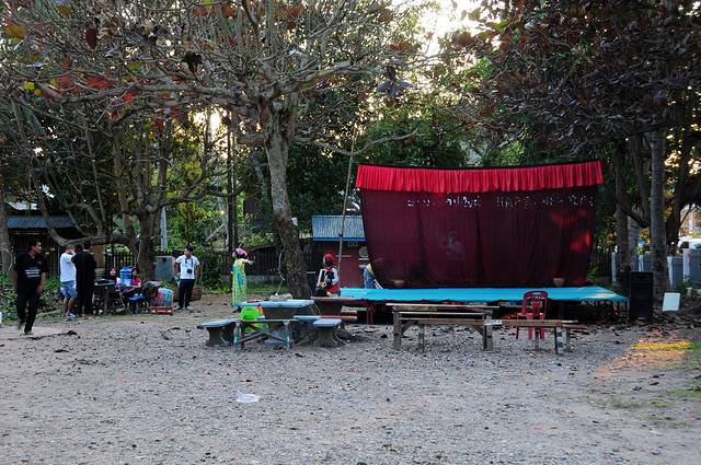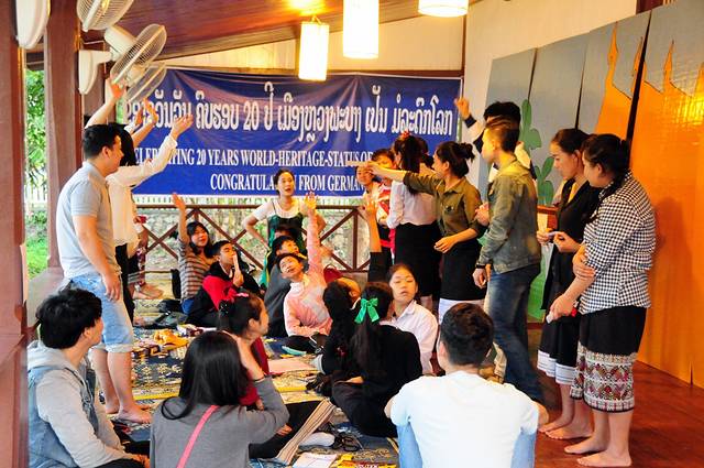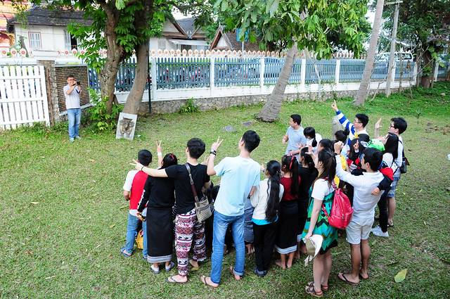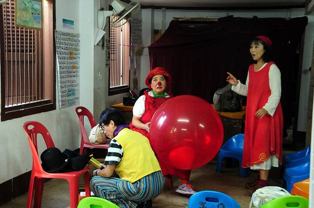 在农西昆芒寺(Vat Nong Sikhounmang)看见围墙上的装饰很特别,它的对面是艺术学校Arts School,进去一看,有韩国志愿者在搭设舞台,可能有个什么活动吧?舞台旁边的屋子里有韩国大姐在做演出前的准备,还可爱的用韩语和我搭讪,可惜我听不懂。楼上有韩国年轻的志愿者在和当地小朋友做有奖竞猜的活动,场面很温暖。本想呆在这里看完表演再走,可惜我的手机和单反都快没电了,想着他们三个还在等我吃晚饭只能离开。