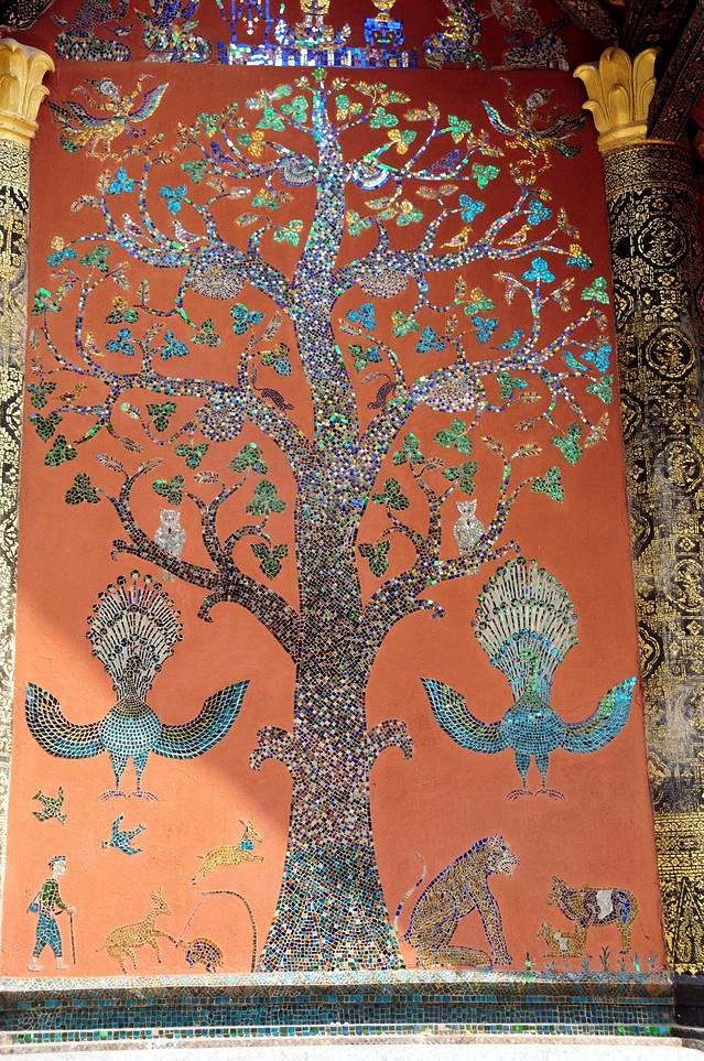 香通寺是琅勃拉邦最著名最漂亮的寺庙,浓缩了琅勃拉邦古老的寺庙建筑风格。主庙大殿是典型的琅勃拉邦寺庙建筑风格,寺顶向下一直延伸到地面。它的正面的墙和梁柱,黑底金饰,精致美观。此寺庙是由塞塔提拉王兴建于1560年,一直受王室保护,直到1975年。1887年遭到破坏,1928年在西萨旺冯王的干预下,得到了修复。寺院内8根粗大的支柱上用黄金刻着图案,把人们的目光引向后面金光闪闪的佛像和光轮覆盖的屋顶。寺院外面的后墙上镶嵌着栩栩如生的“生命之树”镶嵌图案,“生命之树”几乎已成为琅勃拉邦的象征之一,是旅游纪念品的经典图案,四周的墙上有着令人惊艳的镶嵌画 。