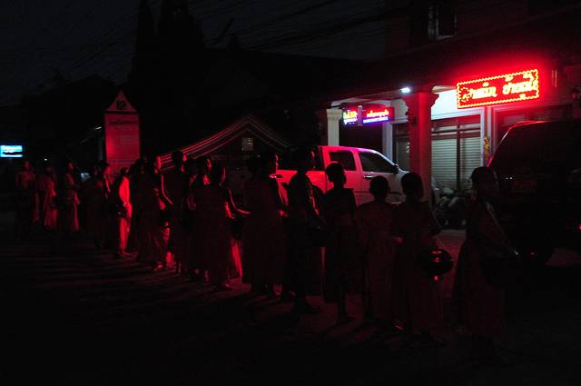5:30起床,趁着夜色去看布施,当地人称其为“塔芭”(Tak Bak, the morning alms,或alms giving)。