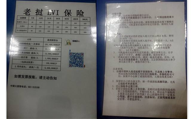 在镇上加油275元(5.86元/升)越走越贵的油啊!刚到海关大楼,一大群背斜挎包的湖南人围上来问换钱吗?其中一个长相憨厚的小伙子热情介绍通关流程。8:30进入海关大厅办理相关手续,看见很多网友说要办理检疫健康证,但是我们去的时候,不知道什么原因,没有要求办理健康证,每人省了40元。首先是路政手续,交费6元,然后是购买老挝保险,有几种选择,我拍这照片姑娘还不让,赶紧咔擦一张。我们买的是15天100元人民币,当时我还有些犹豫是否该再买几天,网上说要比实际行程多买几天才不会被老挝警察罚款,换钱的小伙子告诉我说不必在这里买,可以在老挝境内去买还便宜,这里毕竟是代卖会贵一些。这个保险可以在磨憨口岸,也可以在磨丁口岸购买,这样的语言交流无障碍,我还是在国内办吧