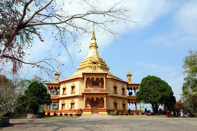 然后回酒店休息后决定按照地图上推荐的景点开车游览。第一个就是巴蓬庖寺(Wat Pa Phon Phao或VAT PHONGPHAO;旧称Phra That Khong Santi Chedi)寺庙,寺庙建于1988年,已成为老挝最受欢迎的景点。巴蓬庖寺的山顶,有一座金色的和平塔,这座宏大的黄色佛塔共有三层,顶层有一个观景台,可将周围平原风光尽收眼底。由于关这门我们无法进入室内,室内墙壁喷绘着各种各样佛教徒的故事以及那些佛家道德劝诫。在巴蓬庖寺,我们所看到的与其他寺院最大的不同的有许多修行的独栋小屋,我把它叫闭关房,有三四十座之多。