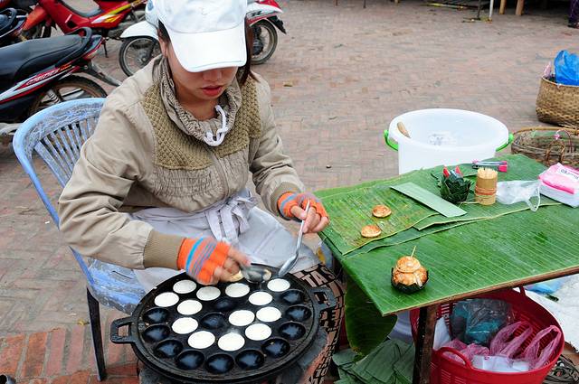 走到法国街也即苏发努冯街(Sisavangvong Road)也叫老外街,街口的小贩在制作供奉用的插花,外焦里嫩的椰子饼很可口,用芭蕉叶做的“碗”里面5个椰子饼每份1万KIP。