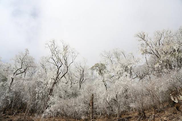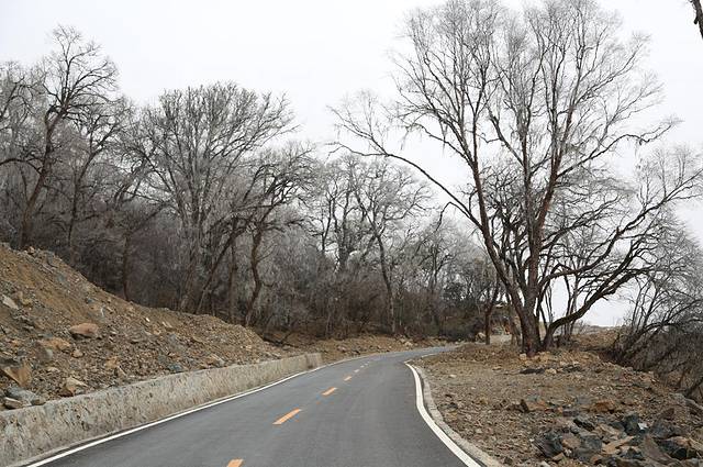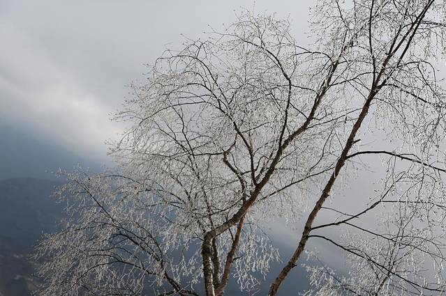 海拔高,气温低,到道两旁的树,都结了雾凇,晶莹剔透。