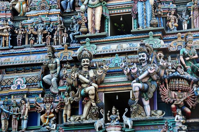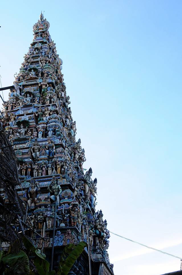 然后去参观了一个印度教的寺庙,位于海街中段,为供奉湿婆的儿子战神穆鲁甘而建。寺庙入口都装饰着大量的印度教神像,造型精致。