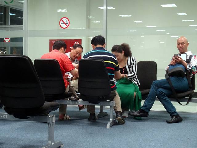 同样,机场候机室内国人高声喧哗,斗地主吼声震天,值班的工作人员态度不是很友好的在处理一位遗失登机牌的国人的麻烦,反正那场面就像一个集市!