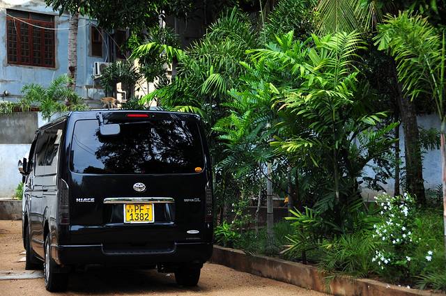 这一切搞定之后出来,一股热浪扑面而来,哈哈,这也许是斯里兰卡的“热情”!找了半天没见到有人举牌接我们,这下傻眼了,打电话给租车公司老板,OMG,一阵极富南亚口音的鸟式”英语“基尼哇啦听不懂,他可能也知道我听不懂他的话索性就挂了电话,这下我更是一头雾水!其实他是在给接车的司机打电话。无奈之下我拿着手机去向一个穿制服的停车场工作人员求助,突然有人捅我一下,回身一看,一个皮肤黝黑的小伙子手里拿张写有我名字的纸,终于接上线了!他开过来一辆黑色的丰田平顶面包车,我急于上车享受空调跑到车的右边,一拉们,哇,右舵!!哈哈,司机还以为我想开车呢!