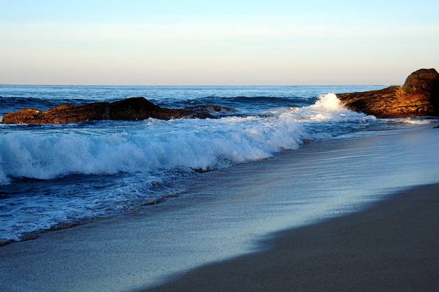 清晨的海滩安静,海浪卷起浪花拍向沙滩,偶尔有晨跑的老外