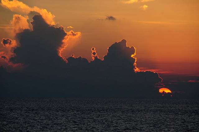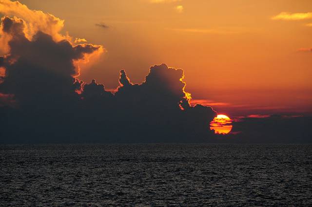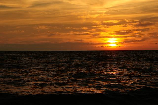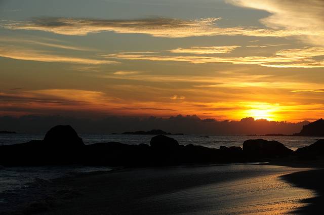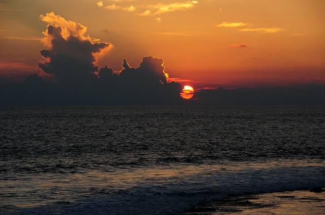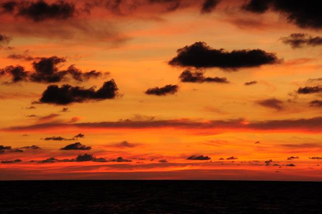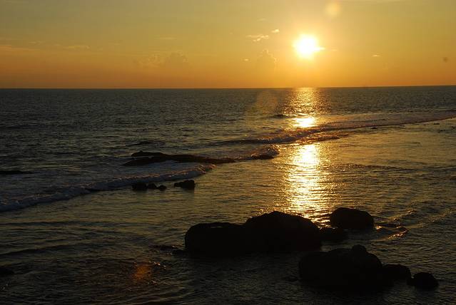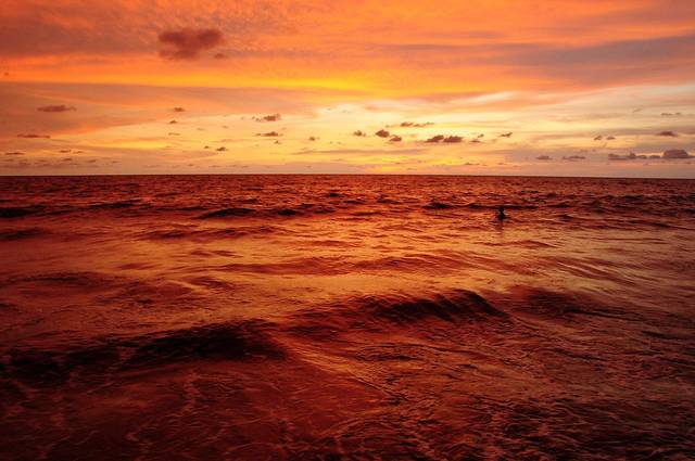 傍晚时分,小渔村与漫长的海岸线连成一体,踏着细柔的沙滩沿海漫步,晚霞点燃了天空,映红了海面。朝西望去,满圆的太阳就挂在海平线上,分秒中寸寸沉陷。透过 椰子树的剪影,渔民们三三俩俩与大海玩游戏,那种闲散和宁静仿佛让人忘了光年。