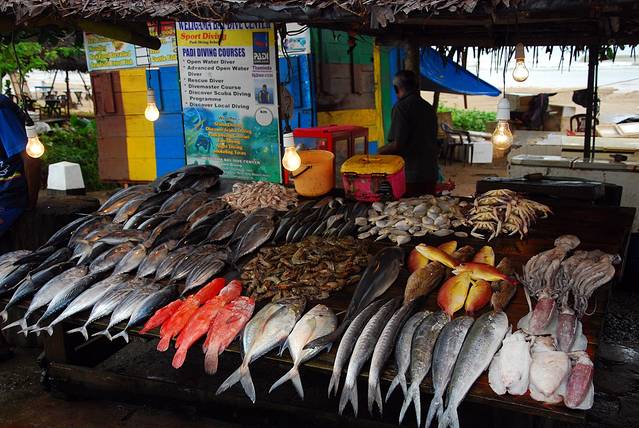 海滩边有一个鱼市,明天的佛教新年会闭市,所以今天特别热闹,海鲜都是今天一早从海里打捞的,叫不出名字的海鲜煞是诱人,我拿了3000RS给老板请他帮买螃蟹和虾各一公斤,因为等我们出海回来鱼市就收摊了。