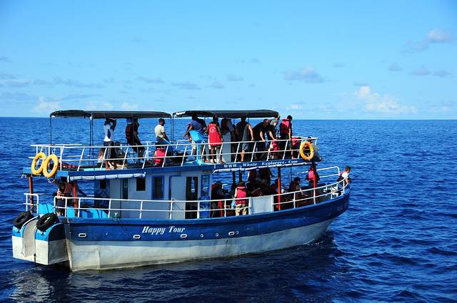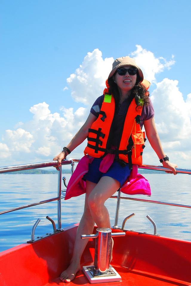 港湾里停满了各式船只,渔船和游艇各自停在一边,老板带着我们来到一条崭新的游船上,告诉我这是他自己的船,他有2条游船,顿时感觉富豪居然亲自开车送我们还帮我们买海鲜,高大上的享受啊!我觉得他的纱笼挺好看,他说花了100美金,算是比较贵的,亲切的笑容让人很容易接近。上船时还做了个登记名字、国籍等等,早餐是面包,水,奶茶,水果,整个船上加上我们也就十来个人吧,而船员也有十来个,星级待遇!!!