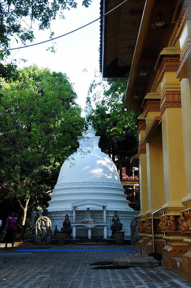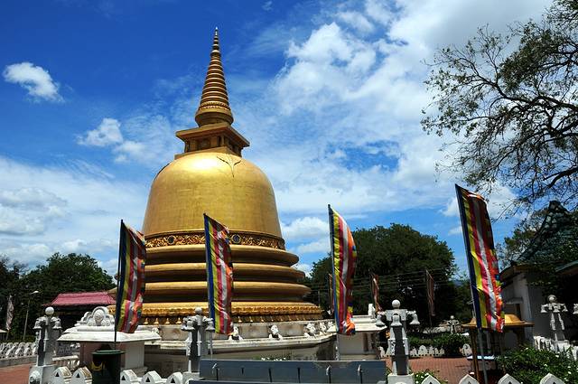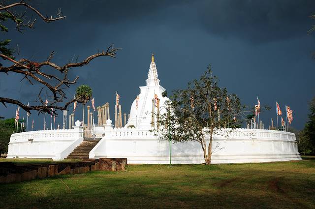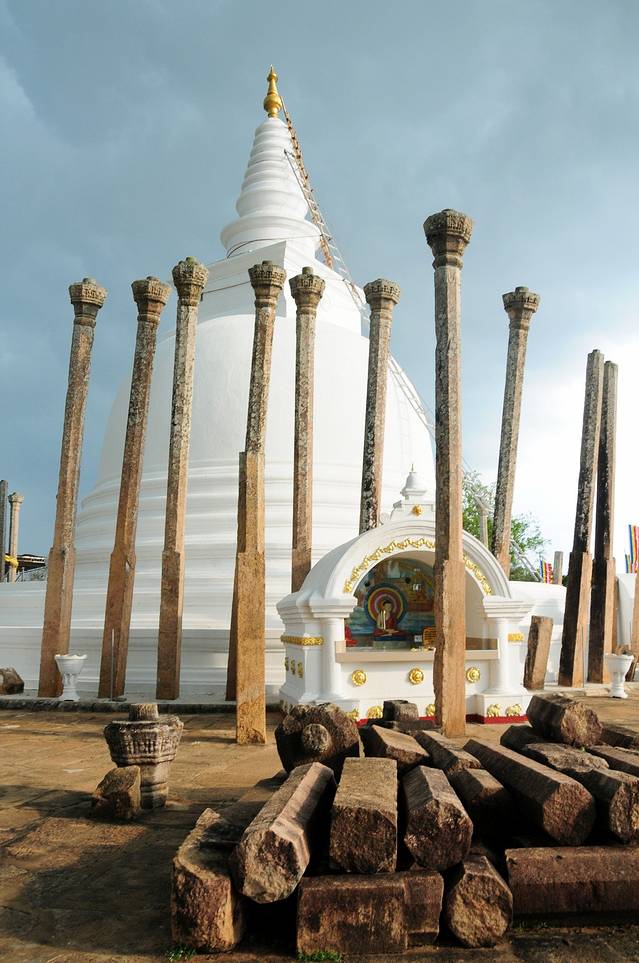 萨帕拉玛舍利塔是古代斯里兰卡最早的佛塔,后被毁。现存的舍利塔是1840年重新修建的,而周围歪斜的石柱,讲述着兰卡本地独有的圆形佛塔的历史。