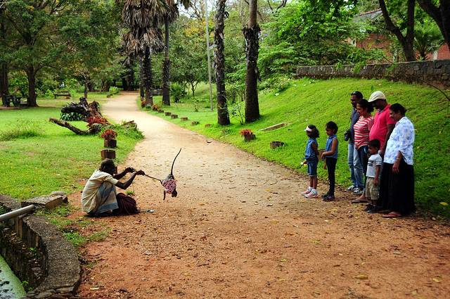 在坡隆拉努沃古城里遇到一家人在看猴子表演